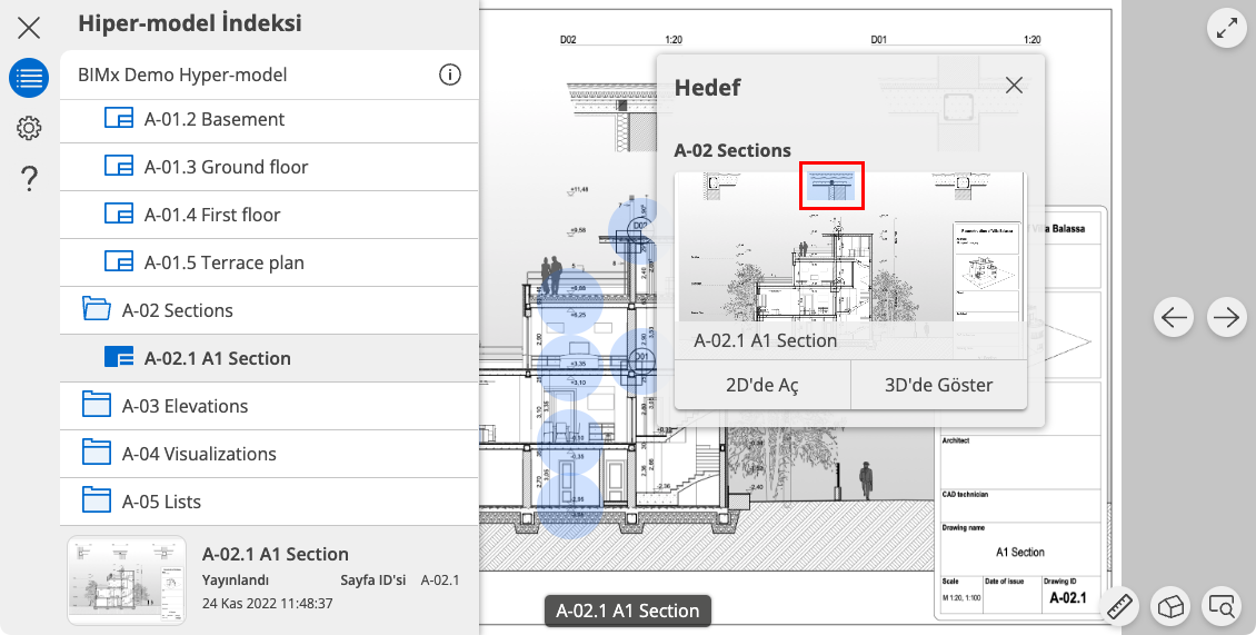 - Pafta birden fazla görünüm içeriyorsa, ilgili görünüm (örneğin Kat Planı veya Kesit) mavi bir dikdörtgenle vurgulanır