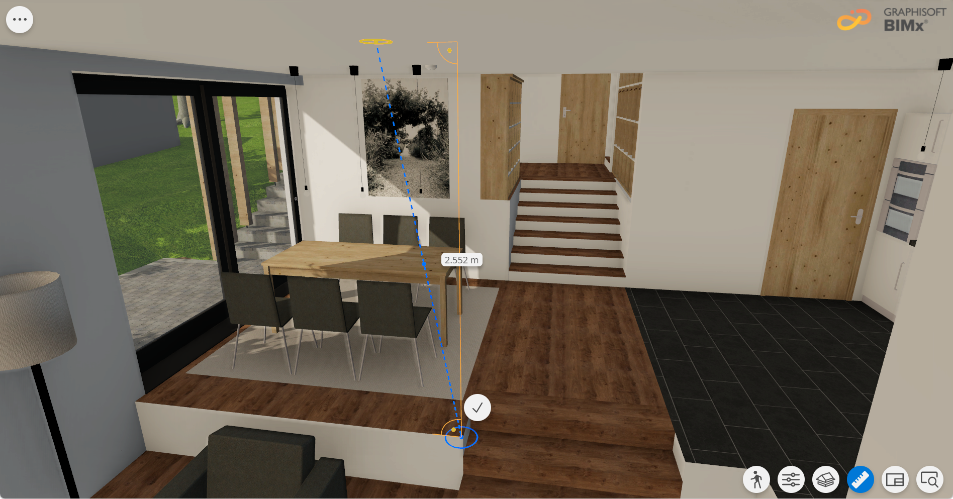 BIMx Hiper-modelinizde bulunan herhangi bir 3D modeli açın. Ölçü aracı 2D ile hemen hemen aynı şekilde çalışır, ancak aşağıdaki farklılıklar vardır:
