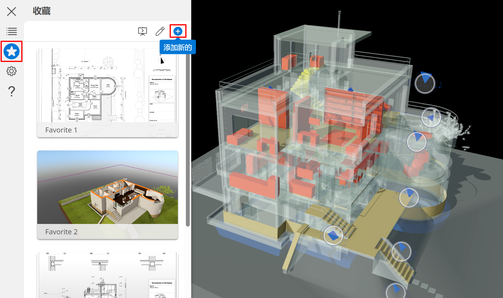- 在 BIMx 菜单中,单击星形打开 "收藏 "面板。