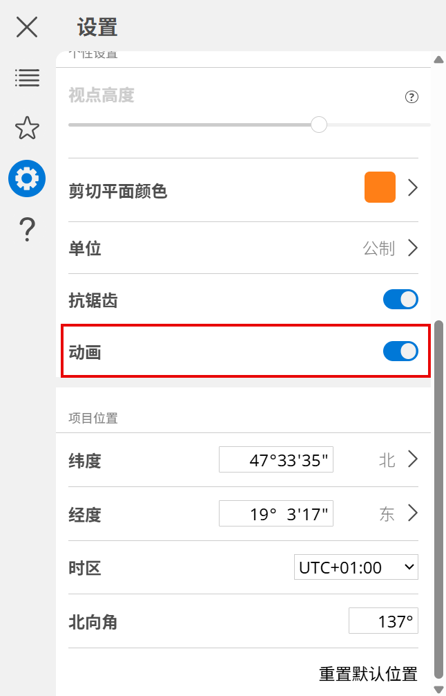 根据您在 Archicad 中设置的位置数据,BIMx 会自动使用真实的项目位置。该位置信息显示在 BIMx 设置中,但您也可以根据需要进行编辑。