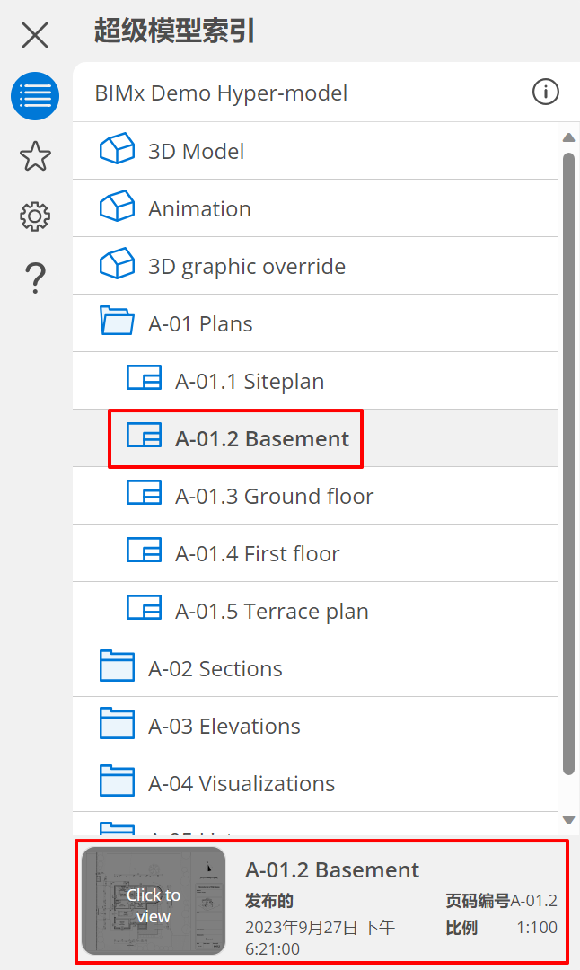開啟三維模型或二維文檔 要開始瀏覽,請開啟超模型視圖 在索引中,執行下列任一操作: 雙擊任何項或檔案夾 點擊某個項並在下方瀏覽其訊息,再在預覽按鈕上點擊“點擊以查看”執行開啟操作。 對於當前開啟的內容,圖標是彩色的。 切換 3D 模型 以當前設定切換到另一個 3D 模型 撤銷/重做