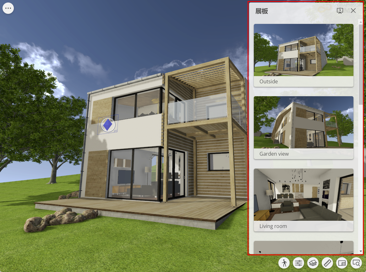 BIMx超級模型的3D模型中可能含有包含一個或多個預儲存、並命名鏡頭位置的展板: 靜態的3D視圖或動畫電影。BIMx 中的展板內容是可選的;如果您在發佈超級模型時在 Archicad 中定義了展板內容,它們就可用。
