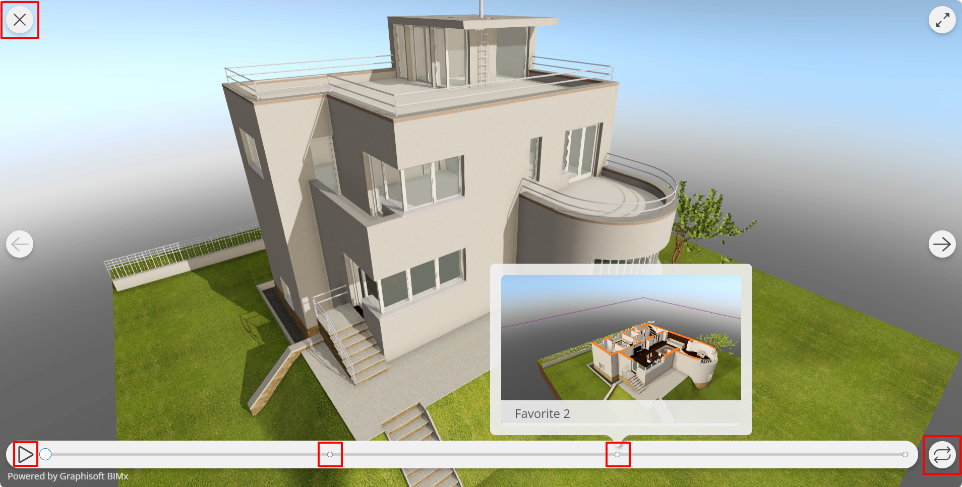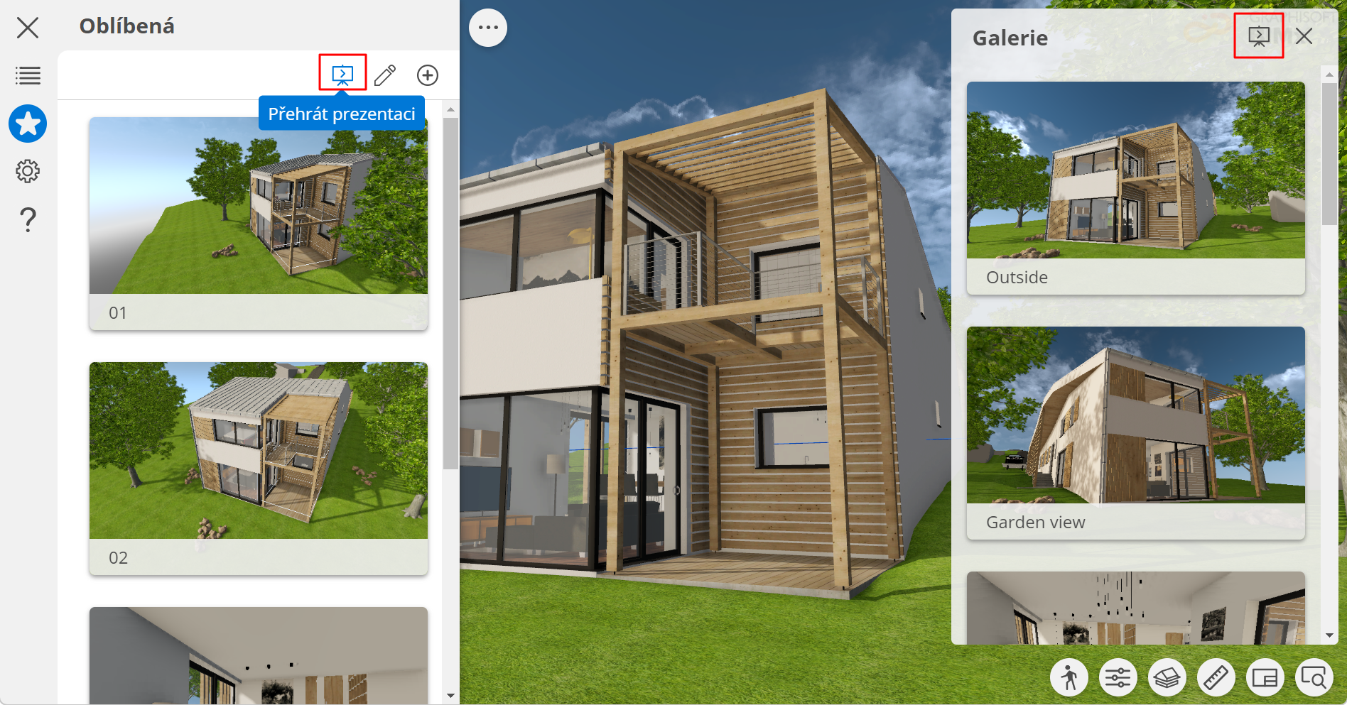 Spuštění animované prezentace položek z BIMx galerie nebo Oblíbených