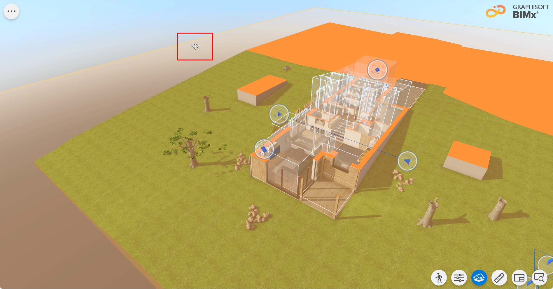 - Najetím na rámeček zobrazíte řezovou rovinu. Barvu můžete změnit pomocí barevné palety v nastavení Barva řezové roviny v nastavení BIMx. Viz Nastavení barvy řezové roviny