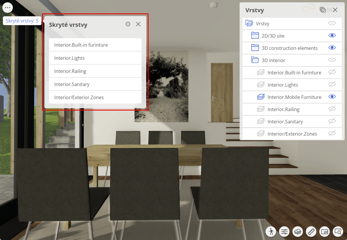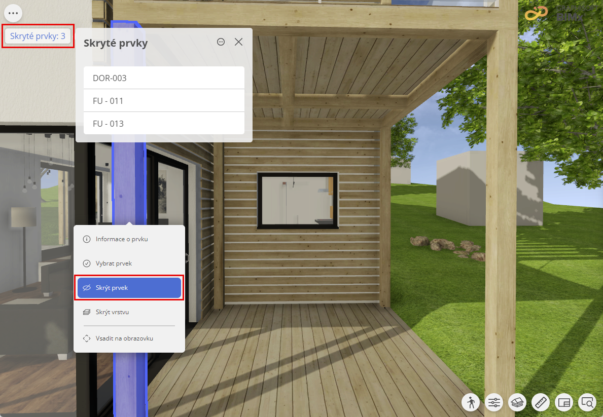 Ovládání viditelnosti 3D prvků a vrstev v BIMx