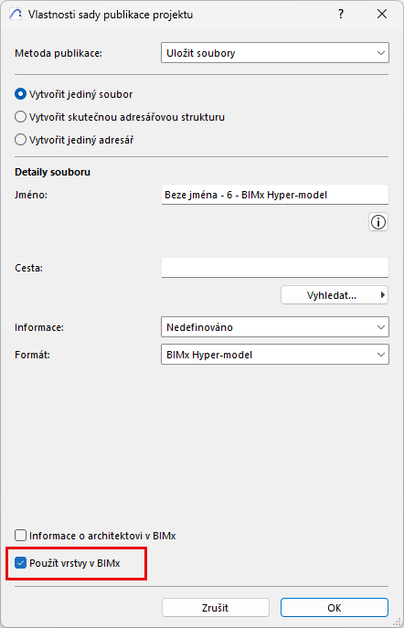 Na rozdíl od Archicadu se při výběru jiné kombinace vrstev v BIMx nezobrazí prvky, které nejsou součástí původního 3D modelu Obsah BIMx Hyper-modelu musí být určen před publikováním.