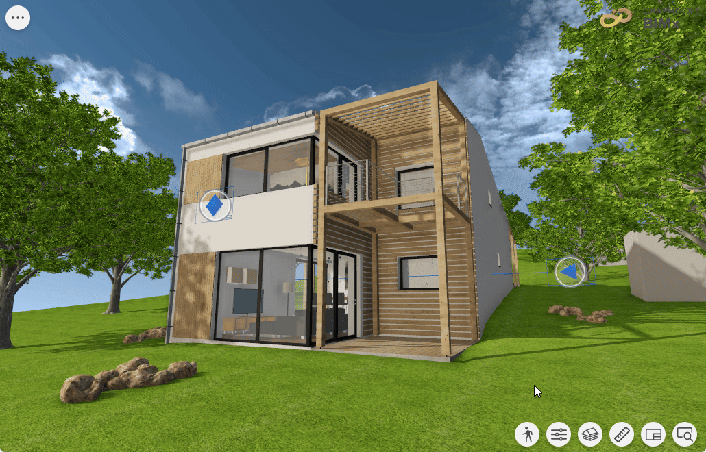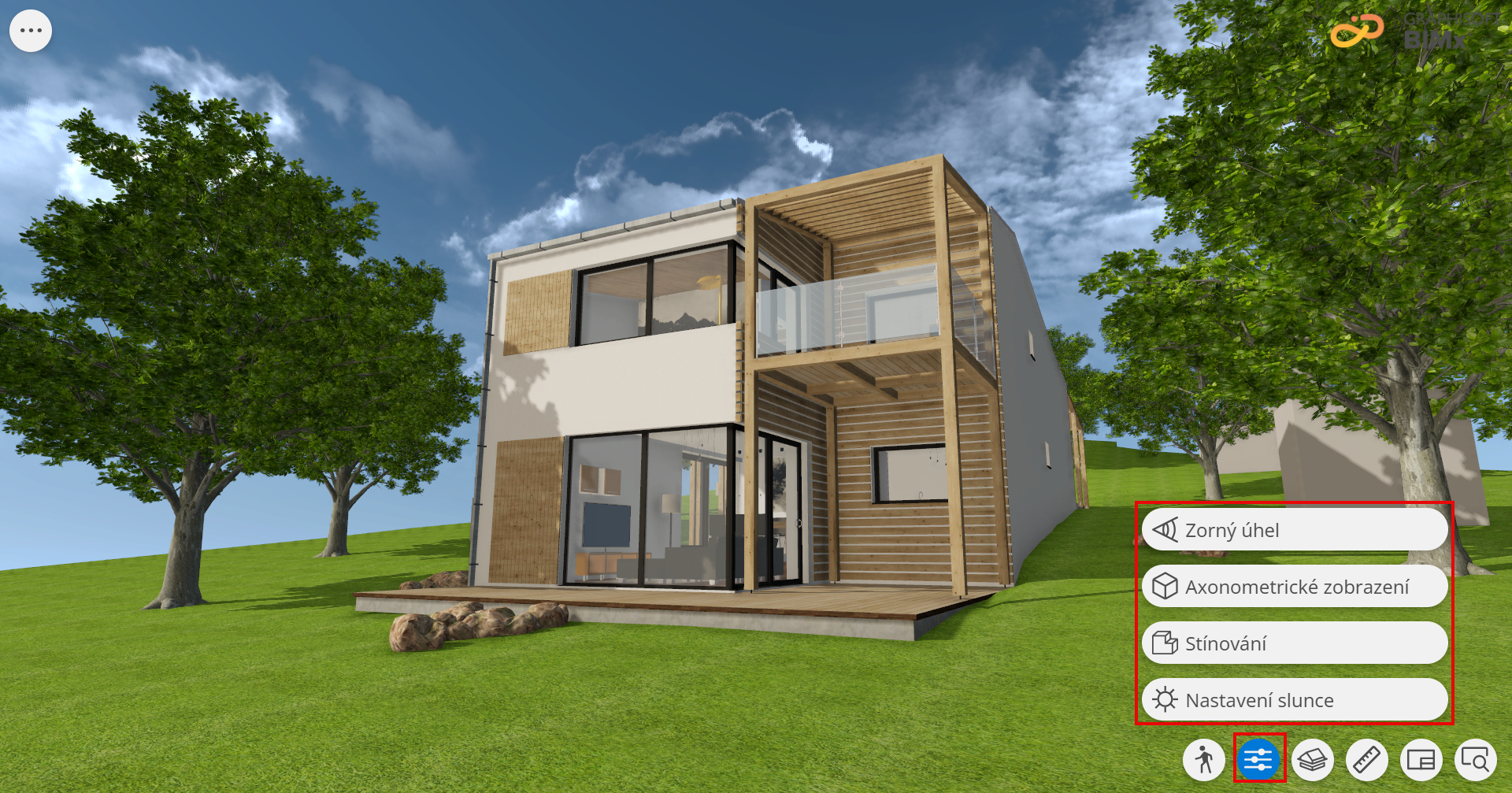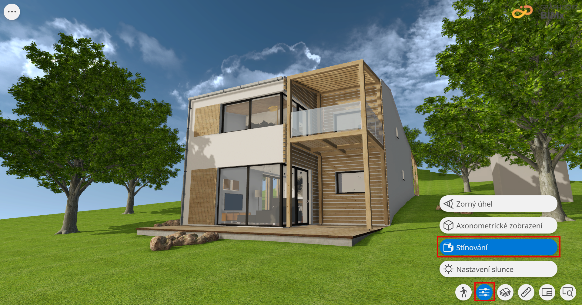 Tip: Dvojklikem nebo poklepáním na prvek se budova zobrazí v čelním pohledu. Takto snadno v axonometrii vytvoříte pohledy/řezy. Využijte je v kombinaci s rovinou řezu, různými nastaveními slunce a času a uložte si oblíbené pohledy.