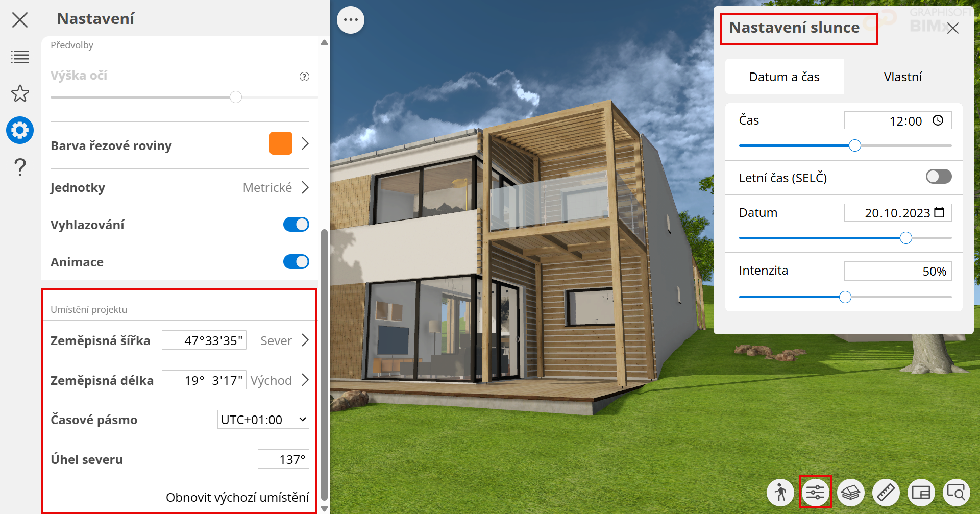 Upravte nastavení slunce - buď podle data a času, nebo jako vlastní polohu slunce. Tímto způsobem můžete získat představu o přesných stínech, které budou vrhány na vaši budovu a okolí na základě umístění projektu.