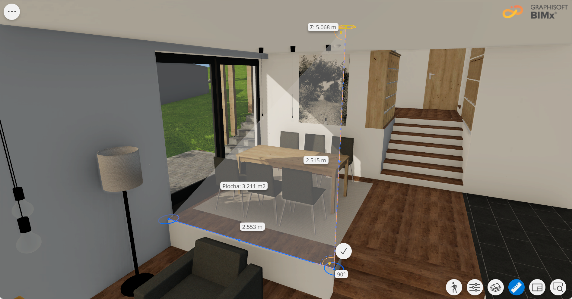 Otevřete libovolný 3D model, který máte ve svém BIMx hyper-modelu. Nástroj Měření funguje téměř stejně jako ve 2D, jen s následujícími rozdíly: