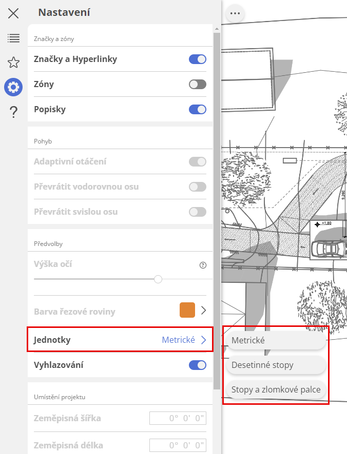 Měřítko můžete upravit kliknutím na štítek v levém horním rohu.