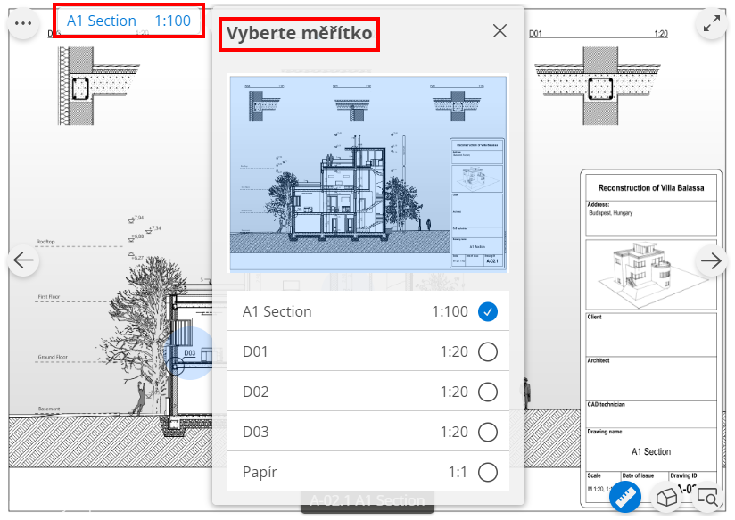 - V jednom z horních rohů se objeví jméno kresby. Kliknutím na jméno kresby otevřete seznam měřítek a kreseb na výkresu.