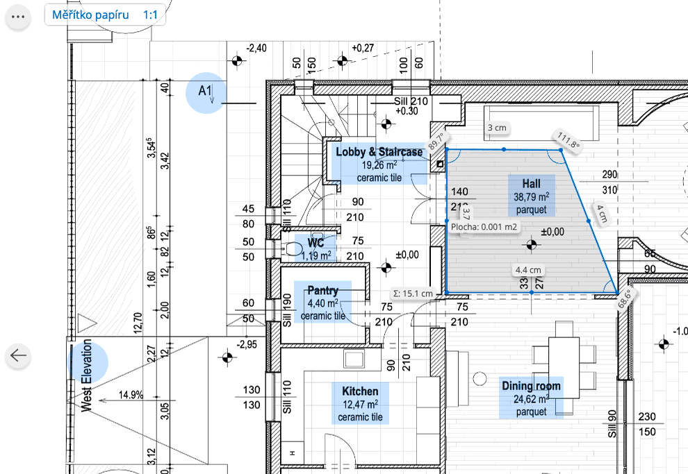 Stačí přejet na bod, od kterého chcete začít měřit, a kliknout na něj. Opakujte. Měření můžete ukončit klávesou Esc, kliknutím pravým tlačítkem myši nebo kliknutím na symbol fajfky.