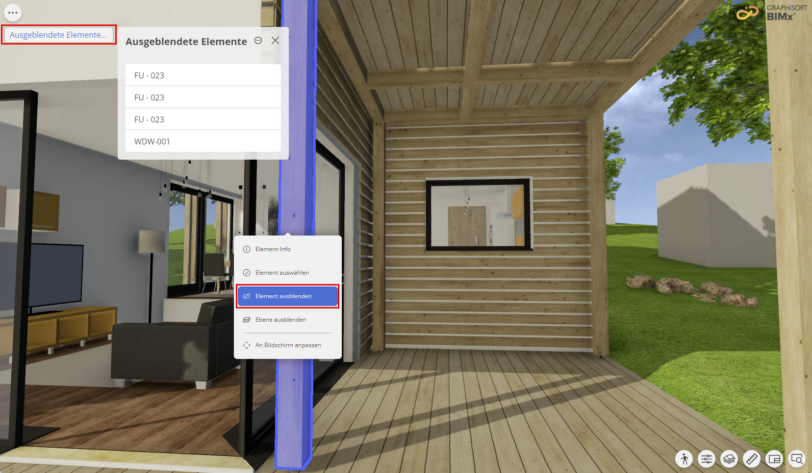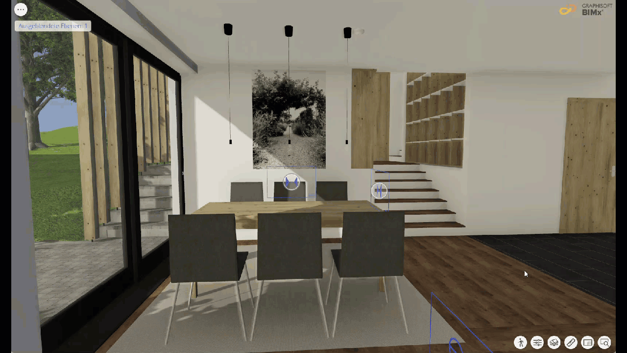 Weitere Informationen zur Steuerung der Sichtbarkeit von 3D-Elementen und Ebenen in BIMx finden Sie unter Ausblenden von 3D-Elementen und Ebenen in BIMx.