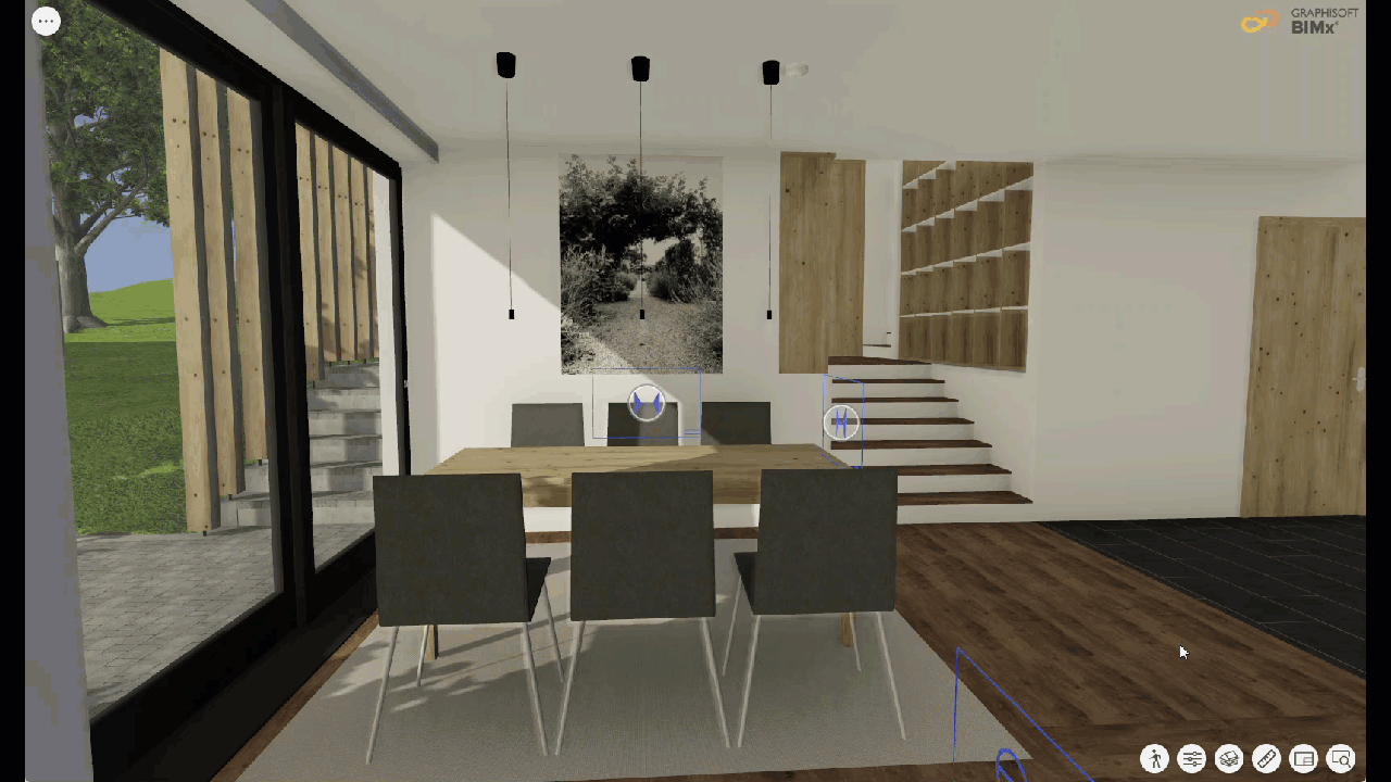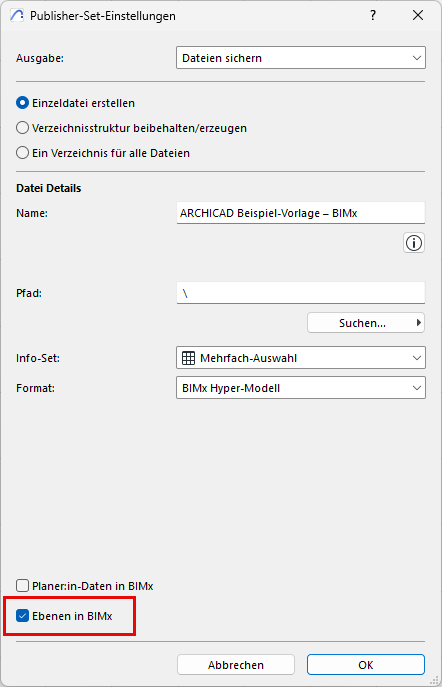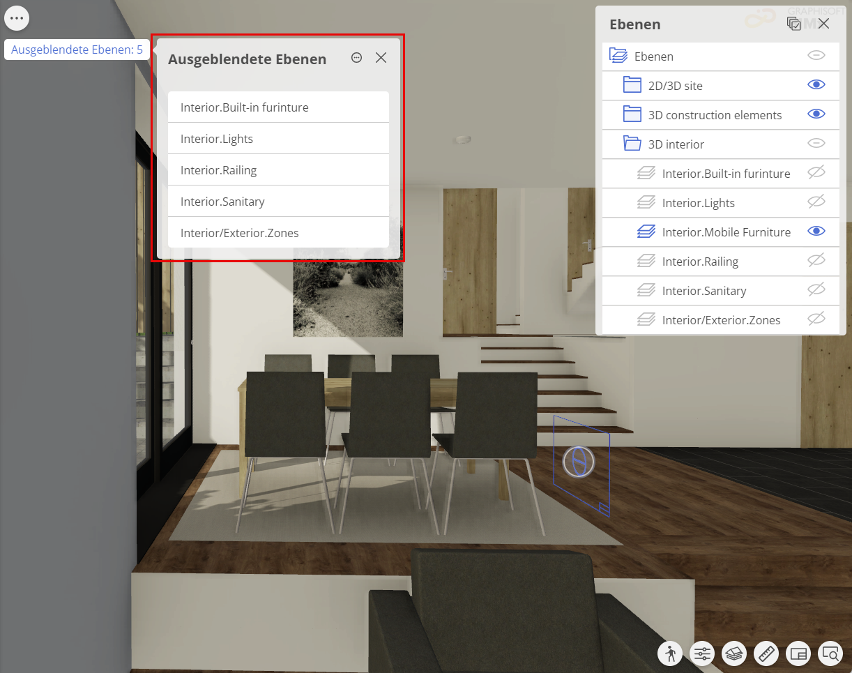 Anders als in Archicad werden bei der Auswahl einer anderen Ebenenkombination in BIMx keine Elemente angezeigt, die nicht im ursprünglichen 3D-Modell enthalten sind. Der Inhalt des BIMx Hyper-Modells muss vor der Veröffentlichung konfiguriert werden.
