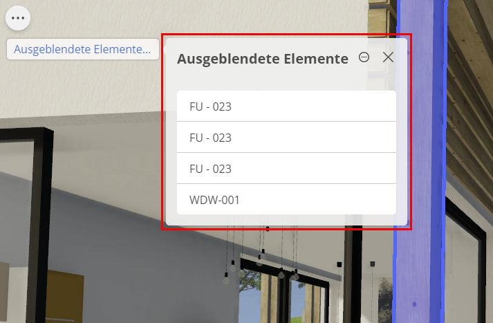 Die Palette listet ausgeblendete Elemente in alphabetischer Reihenfolge nach ihrer Archicad-ID auf.