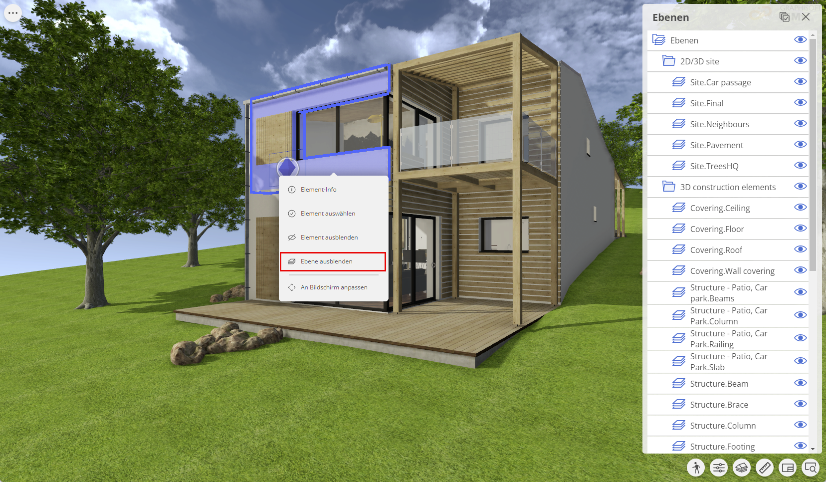 Um die Ebene eines Elements auszublenden, klicken Sie mit der rechten Maustaste auf das Element und wählen Sie im Kontextmenü Ebene ausblenden.