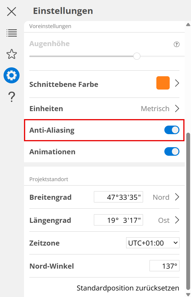 Anti-Aliasing kann die Leistung beeinträchtigen. Wenn die Navigation langsamer wird, versuchen Sie, Anti-Aliasing im Menü Einstellungen zu deaktivieren.
