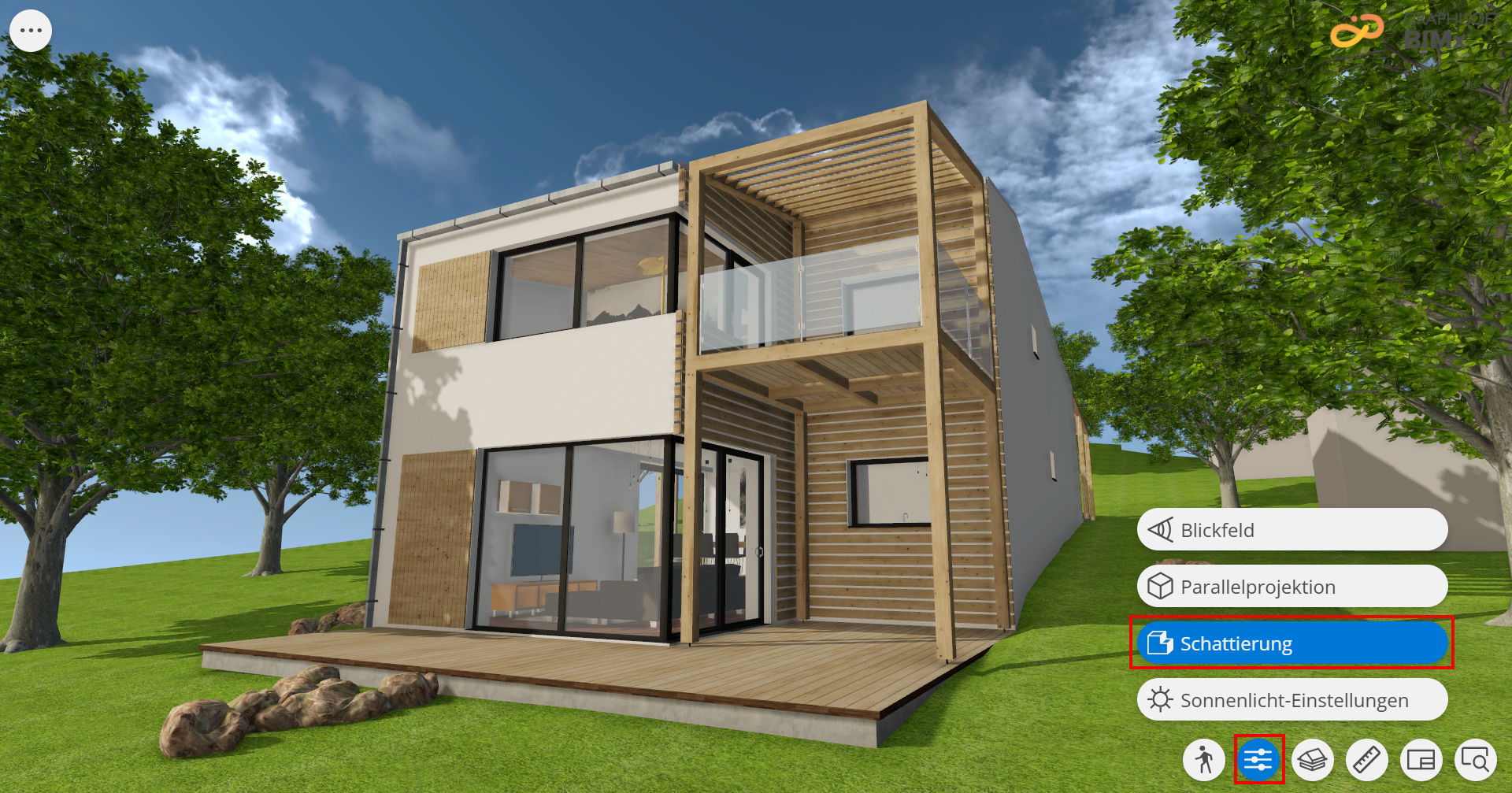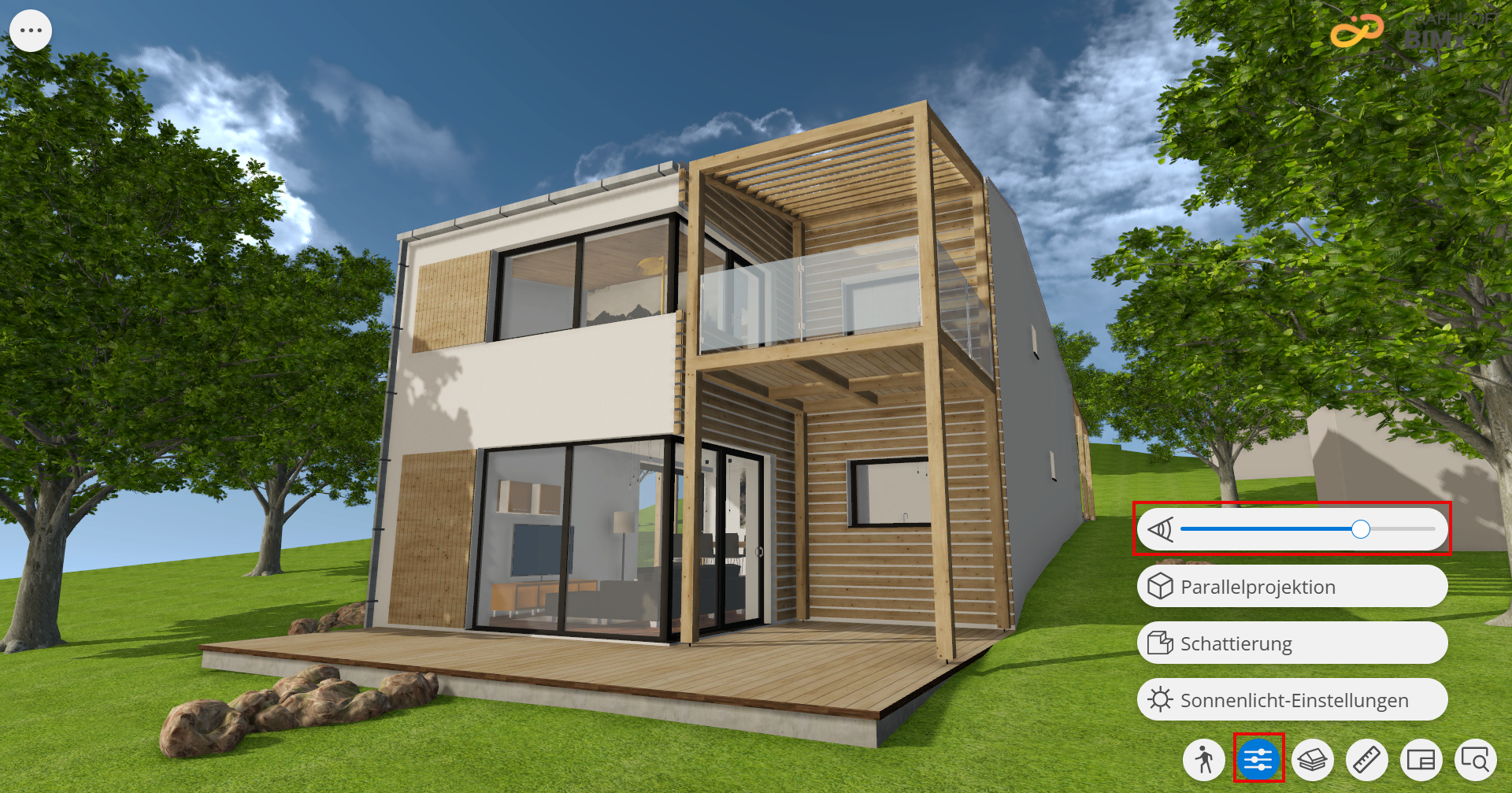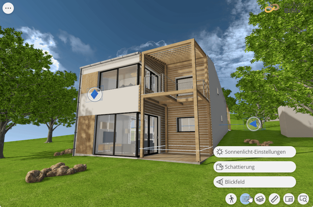 Tipp: Durch Doppelklick oder Doppeltippen auf ein Element wird das Gebäude frontal angezeigt. Dies erleichtert die Erstellung von Ansichts- und Schnittdarstellungen in der Axonometrie. Sie können dies mit einer Schnittebene und verschiedenen Sonneneinstellungen nach Zeit kombinieren und Ihre Lieblingsansichten speichern.