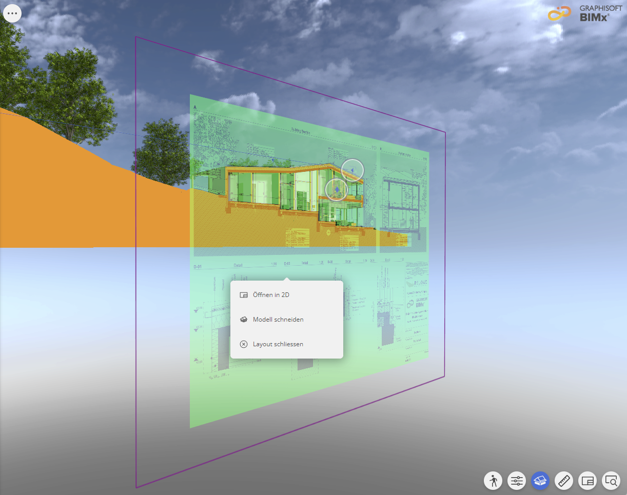 Das 3D-Modell öffnet sich, wobei das Layout überlagert wird, und es wird je nach Ansichtstyp horizontal oder vertikal geschnitten.