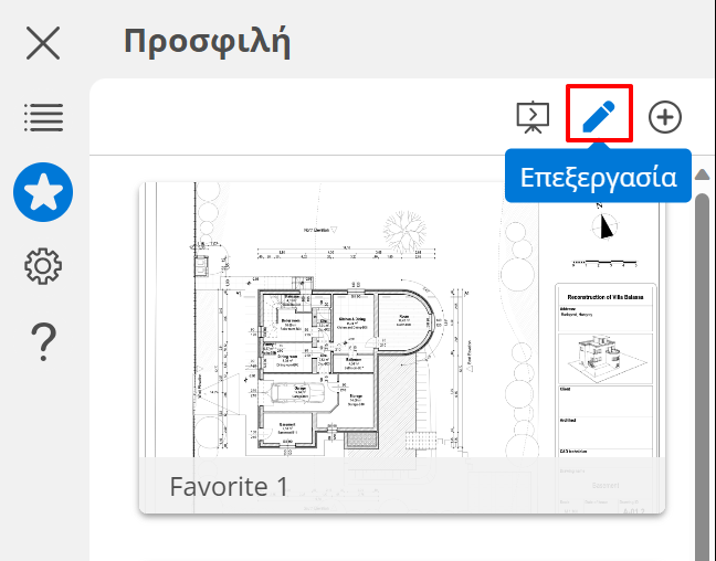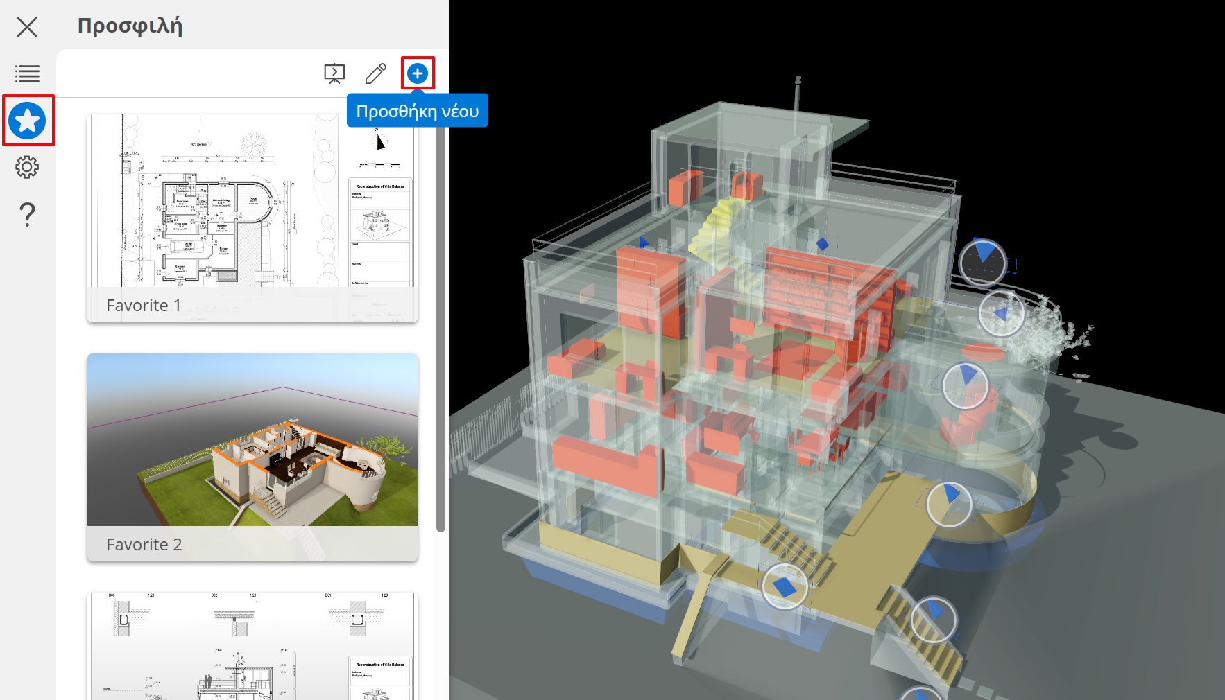 Σε αντίθεση με την Έκθεση (η οποία περιέχει τις θέσεις της κάμερας που αποθηκεύονται από το 3D μοντέλο Archicad), τα Προσφιλή αποθηκεύονται στο BIMx από οποιοδήποτε 2D ή 3D στοιχείο στο Hyper-model, συμπεριλαμβανομένων όλων των 3D ρυθμίσεων που προτιμάτε. Μπορείτε να επεξεργαστείτε τη σειρά και την ορατότητα των Προσφιλών παρουσιάσεων εύκολα στο BIMx.