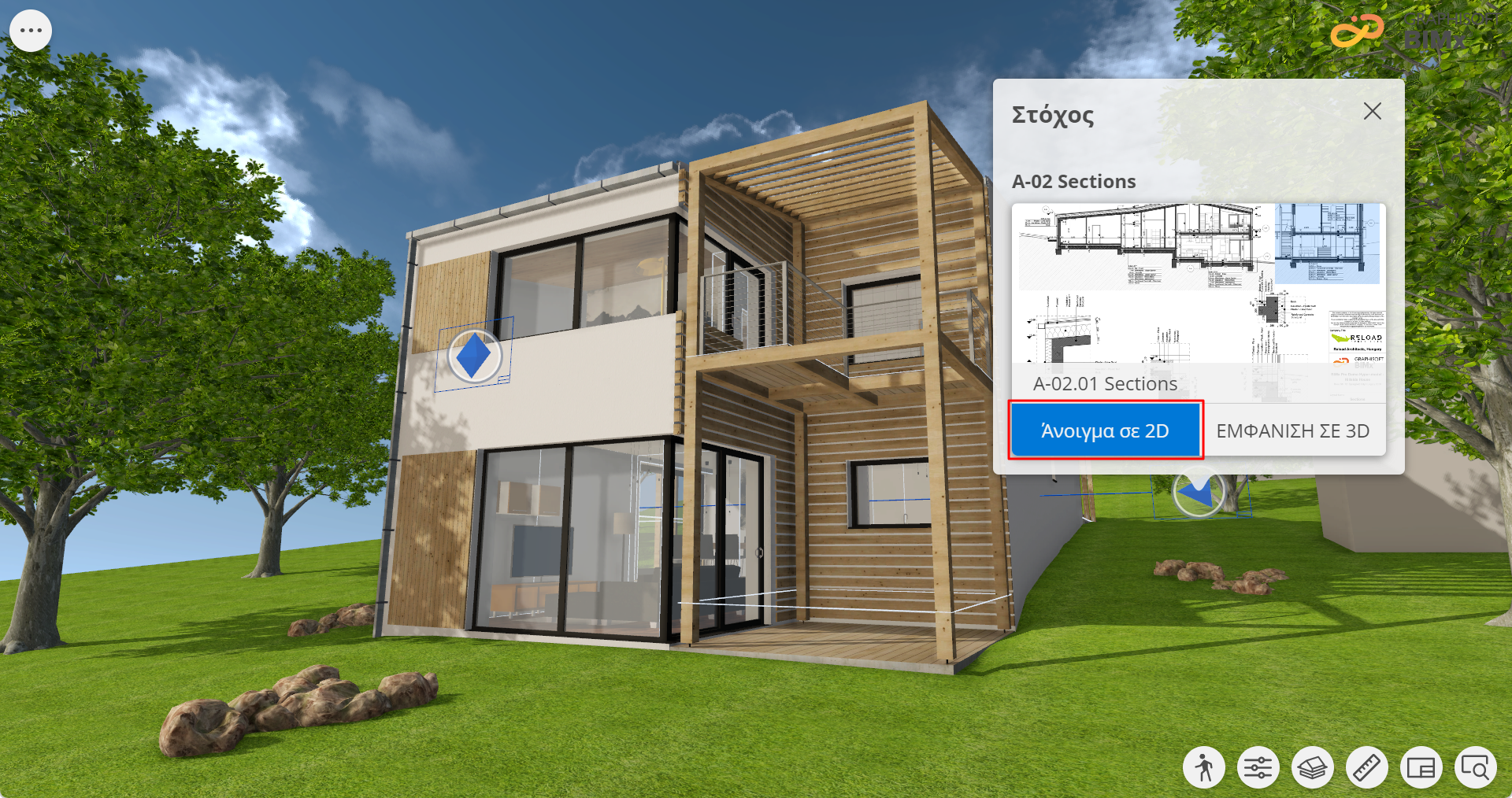 Στον διάλογο Στόχος, πατήστε Άνοιγμα σε 2D ή Εμφάνιση σε 3D για πλοήγηση στην Άποψη που χρειάζεστε. (Ή κάντε κλικ στην προεπισκόπηση Πινακίδας).