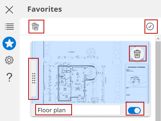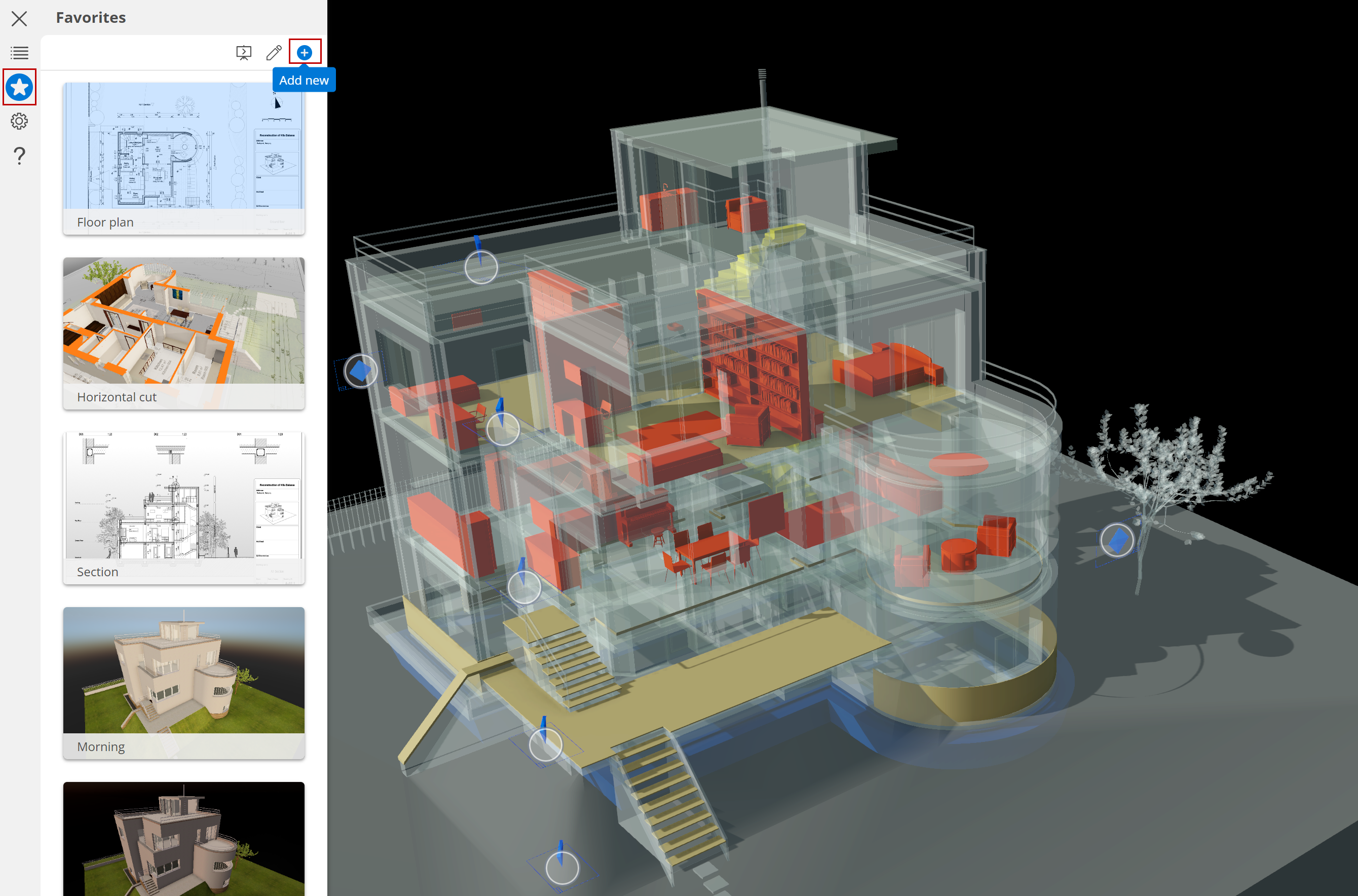 Unlike the Gallery (which contains camera positions saved from the Archicad 3D model), Favorites are saved in BIMx from any 2D or 3D item in the Hyper-model, including all the 3D settings the way you like them. You can edit the order and visibility of Favorites presentations easily in BIMx.