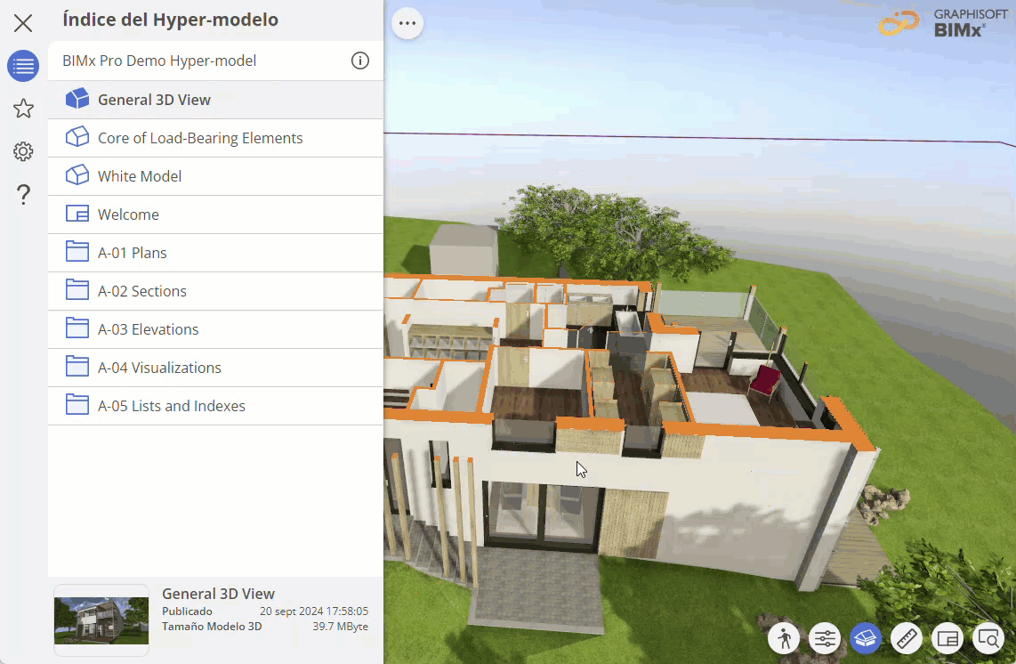 Utilice un color neutro para centrar la atención en el plano o adopte su identidad corporativa con su propia paleta de colores. Sólo tiene que elegir su color personalizado una vez. Se guarda en las Preferencias de BIMx y se aplica a todos los modelos.