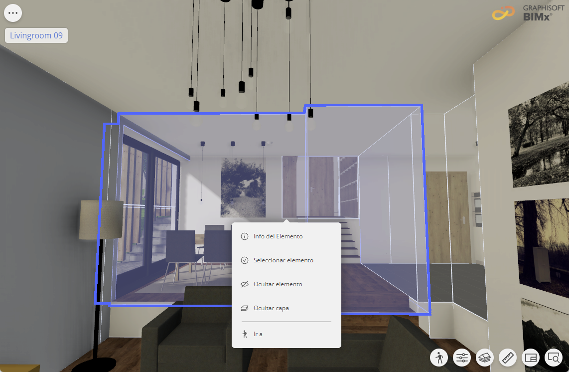 Active la visualización de Zonas en BIMx para ver las Zonas 3D (definidas en Archicad). Las Zonas se muestran como elementos transparentes, en el color de su Categoría de Zona.