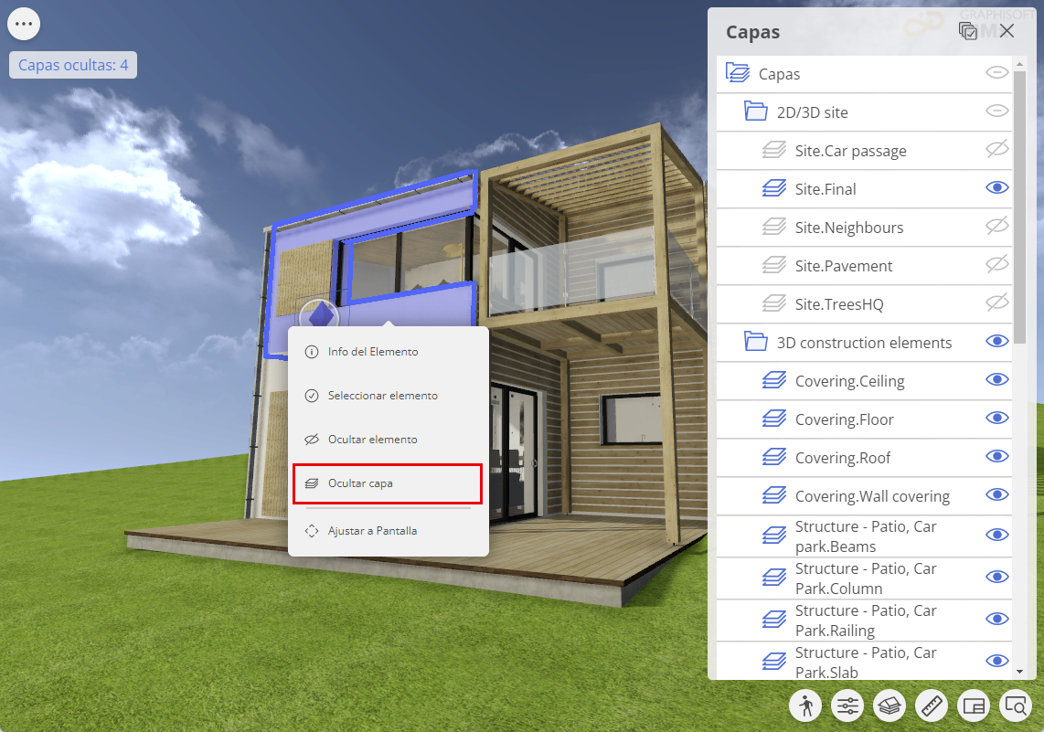 Para ocultar la capa de un elemento, haga clic con el botón derecho del ratón en el elemento y seleccione Ocultar capa en el menú contextual.