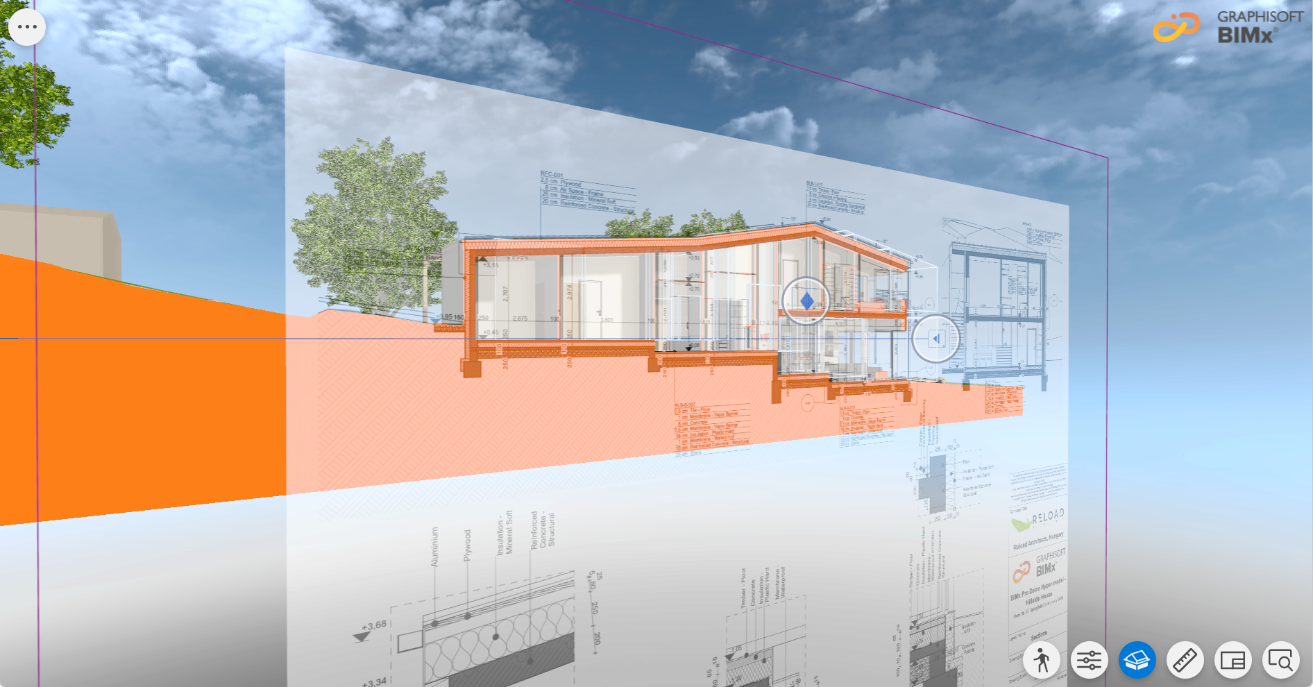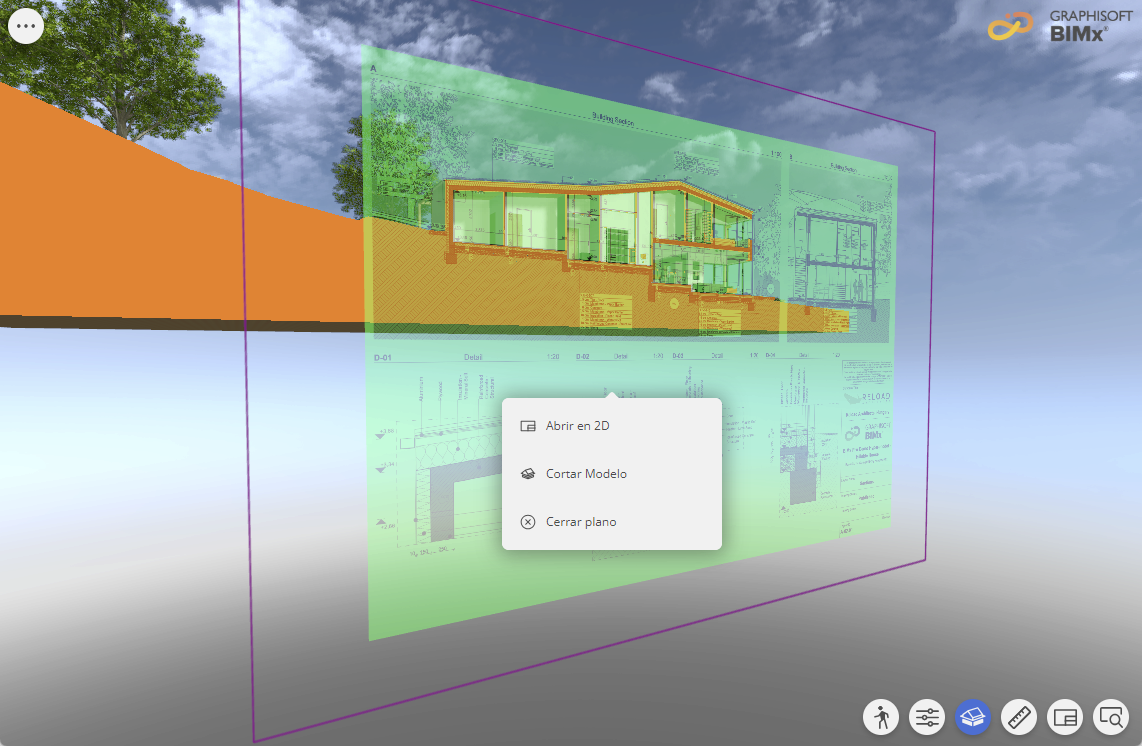 - Cortar modelo para crear un plano de corte 3D temporal Nota: Al hacer clic en el marco se selecciona el plano de corte propiamente dicho (no el difuminado). Haga clic con el botón derecho del ratón para acceder al menú contextual del plano de corte con los comandos Girar y Desactivar. Vea más información sobre el plano de corte aquí: Plano de Corte en el modelo 3D (atajo teclado: C)