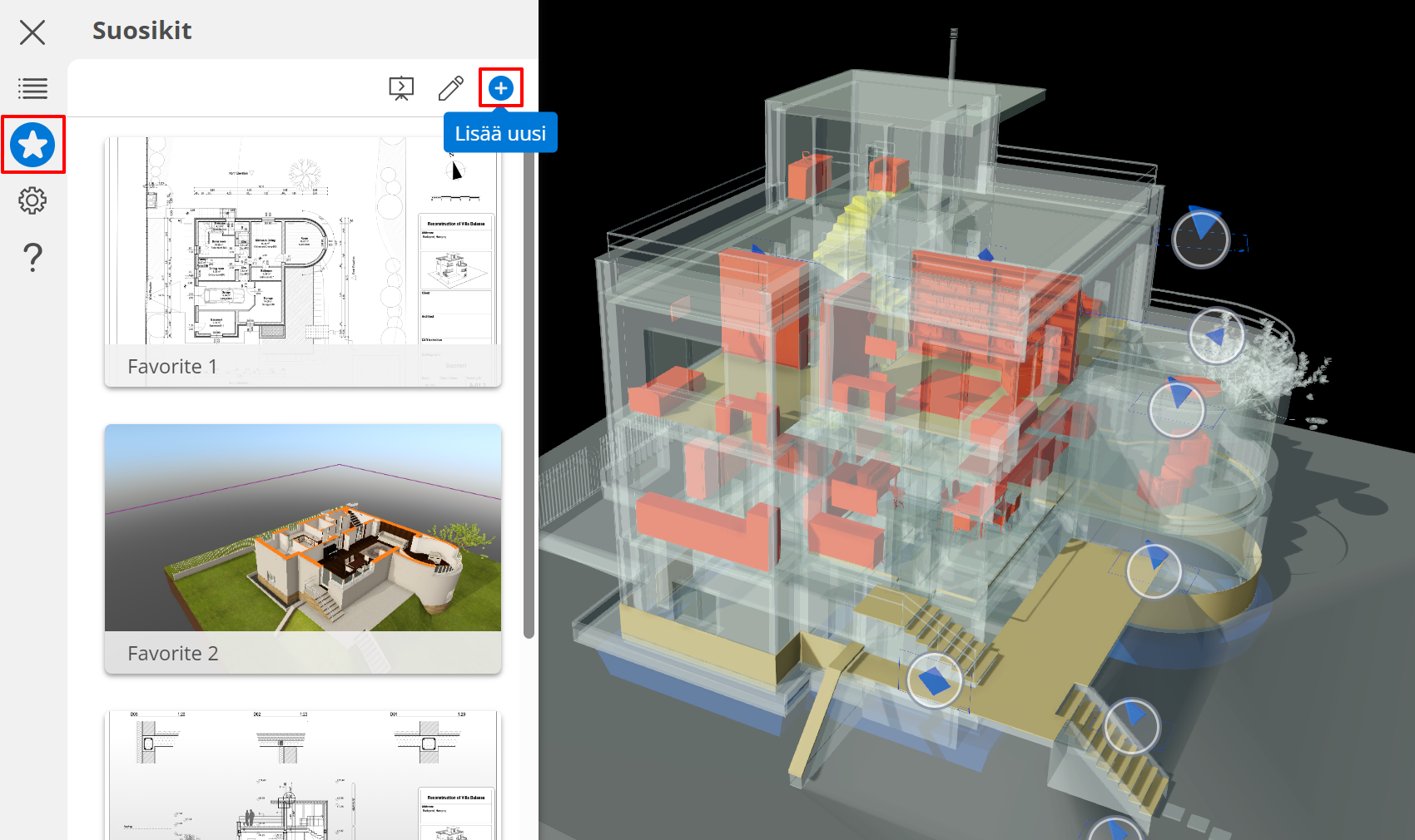 Suosikit helpottavat myös usein käytettyjen näkymien löytämistä BIMx-hypermallista: Kun avaat suosikin, sen lähdemalli tai asettelu korostuu hakemistossa.