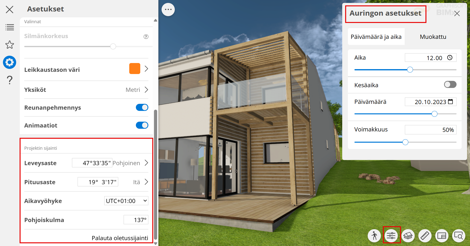 Määritä auringon asetukset – joko päivämäärän ja kellonajan mukaan tai määrittelemällä mukautettu auringon asento. Näin voit visualisoida tarkat varjot, jotka kohdistuvat rakennukseesi ja lähialueisiin projektin sijainnin perusteella.