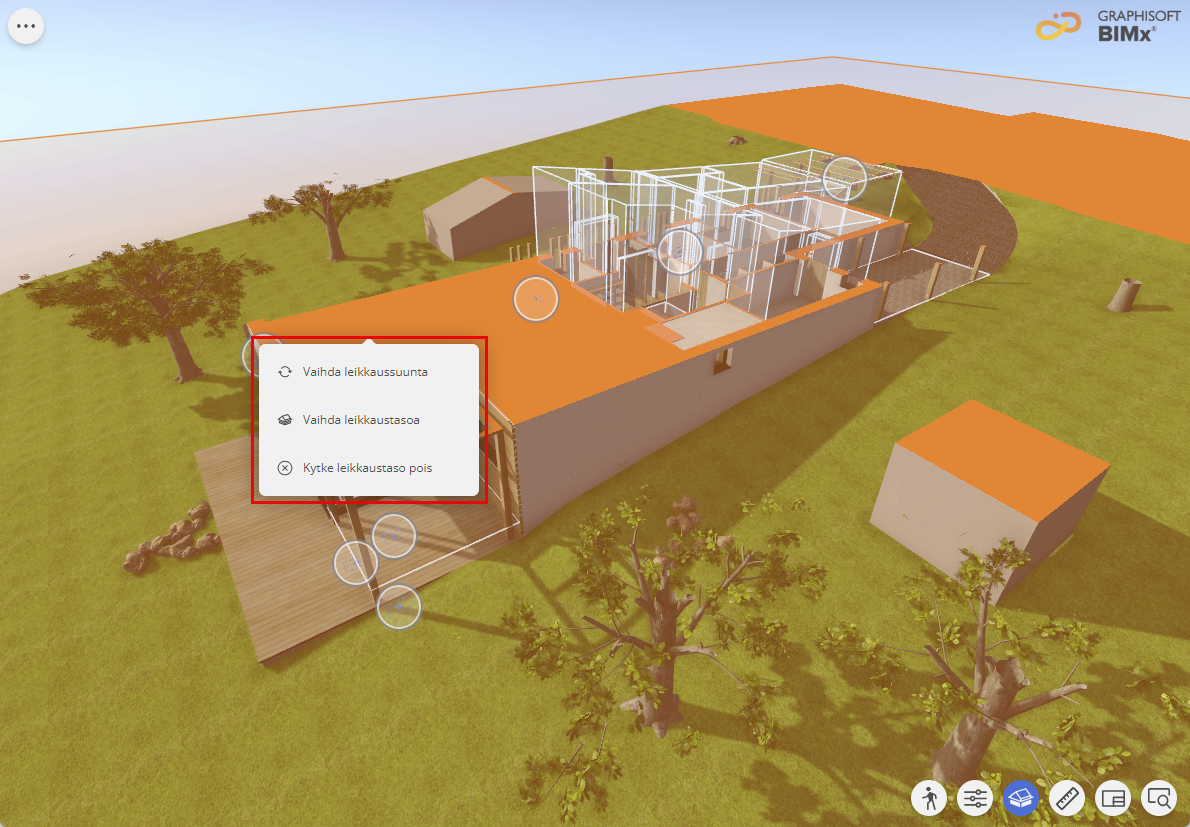 - Placez le curseur sur le cadre pour afficher le plan de coupe. Vous pouvez modifier la couleur du plan de coupe à l'aide du sélecteur de couleur du plan de coupe dans les Réglages de BIMx. Voir Sélecteur de couleurs du Plan de coupe