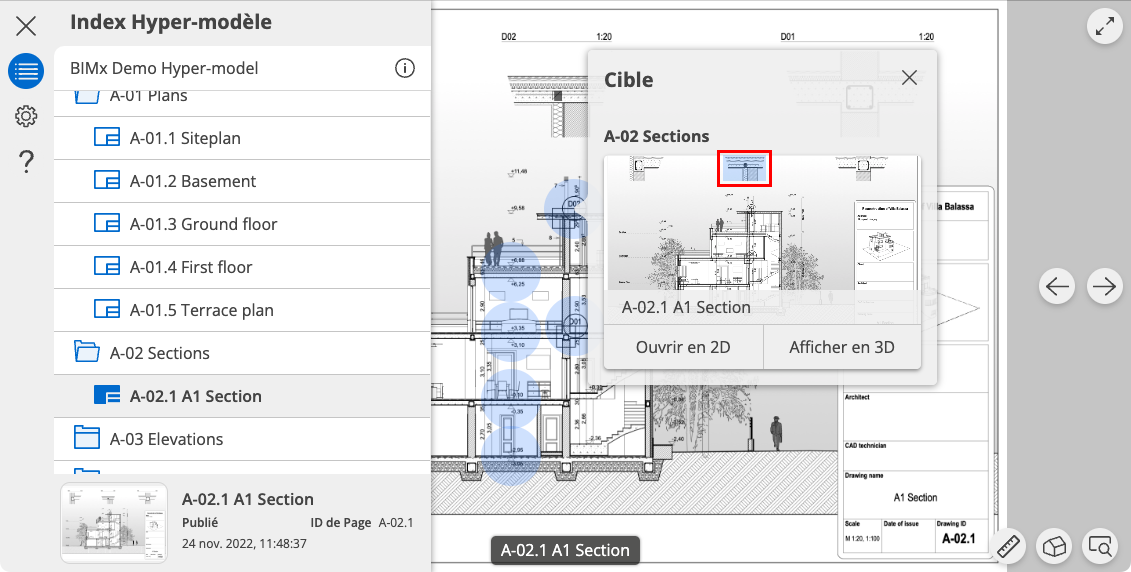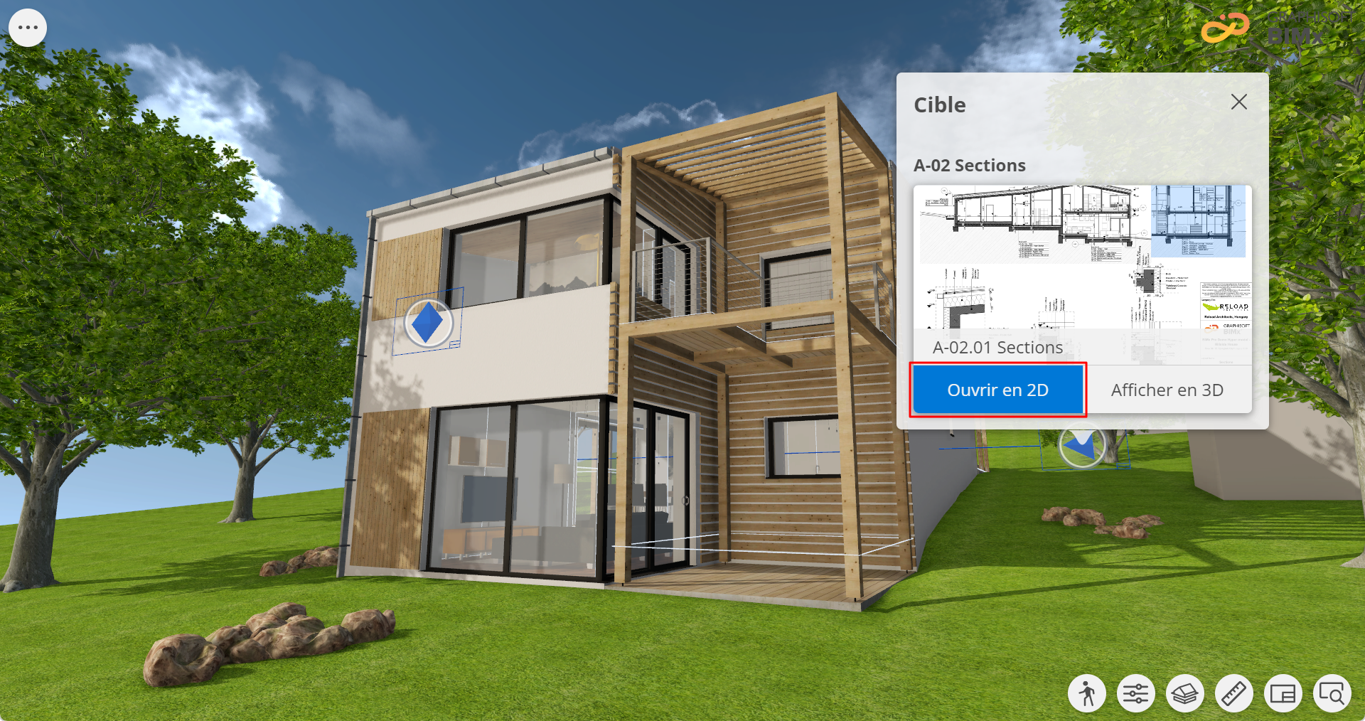 Dans le dialogue Cible, cliquez sur Ouvrir en 2D ou sur Afficher en 3D pour naviguer à la vue dont vous avez besoin. (Ou cliquez sur la prévisualisation de la mise en page).