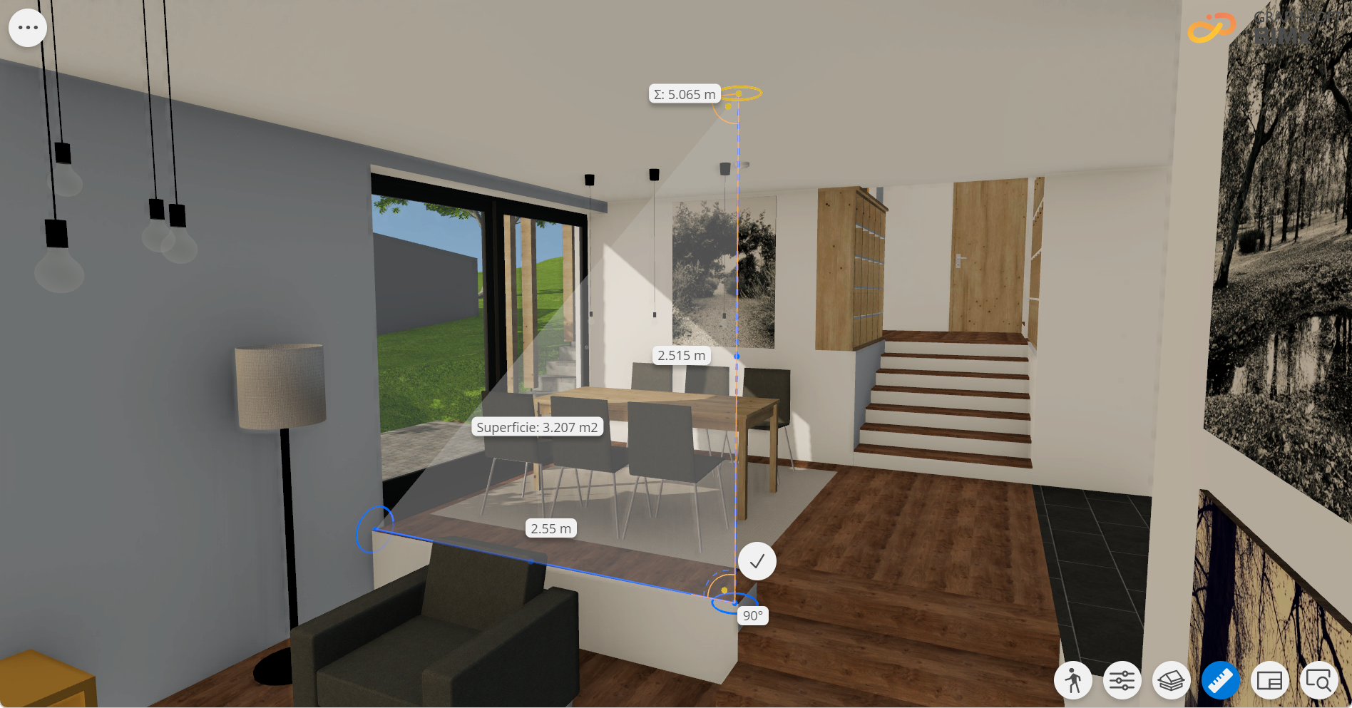 - L'outil Mesure en 3D vous offre des guides intelligents vous permettant d'effectuer des mesures précises. Les lignes guides perpendiculaires vous aident à obtenir des mesures verticales ou horizontales droites. Le cercle orange active tour à tour les surfaces verticales et horizontales pour vous aider à choisir le point de mesure approprié.