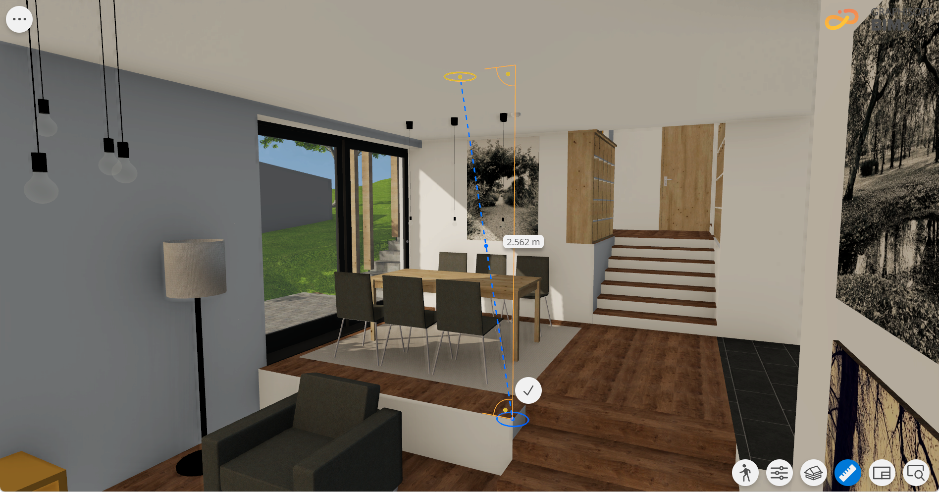Ouvrez n'importe quel modèle 3D de votre Hyper-modèle BIMx. L'outil Mesure fonctionne pratiquement de la même manière qu'en 2D, mais avec les différences suivantes :