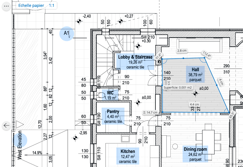 Il se peut que vous souhaitiez mesurer uniquement la longueur d'un mur, ou mesurer une zone fermée. L'Outil sera en mesure de vous donner une zone dès que trois points seront placés. Mesures données :
