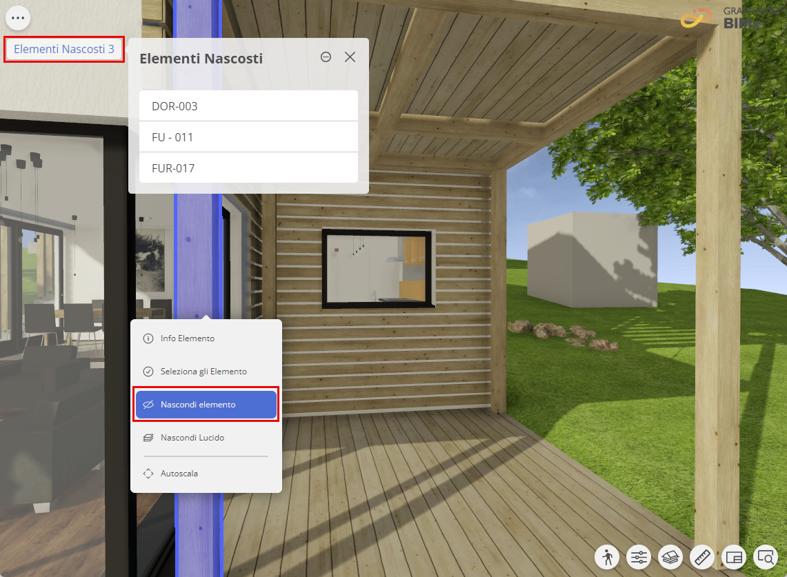 Per saperne di più su come controllare la visibilità degli elementi 3D e dei lucidi, vedere Nascondere elementi e lucidi nel 3D in BIMx.