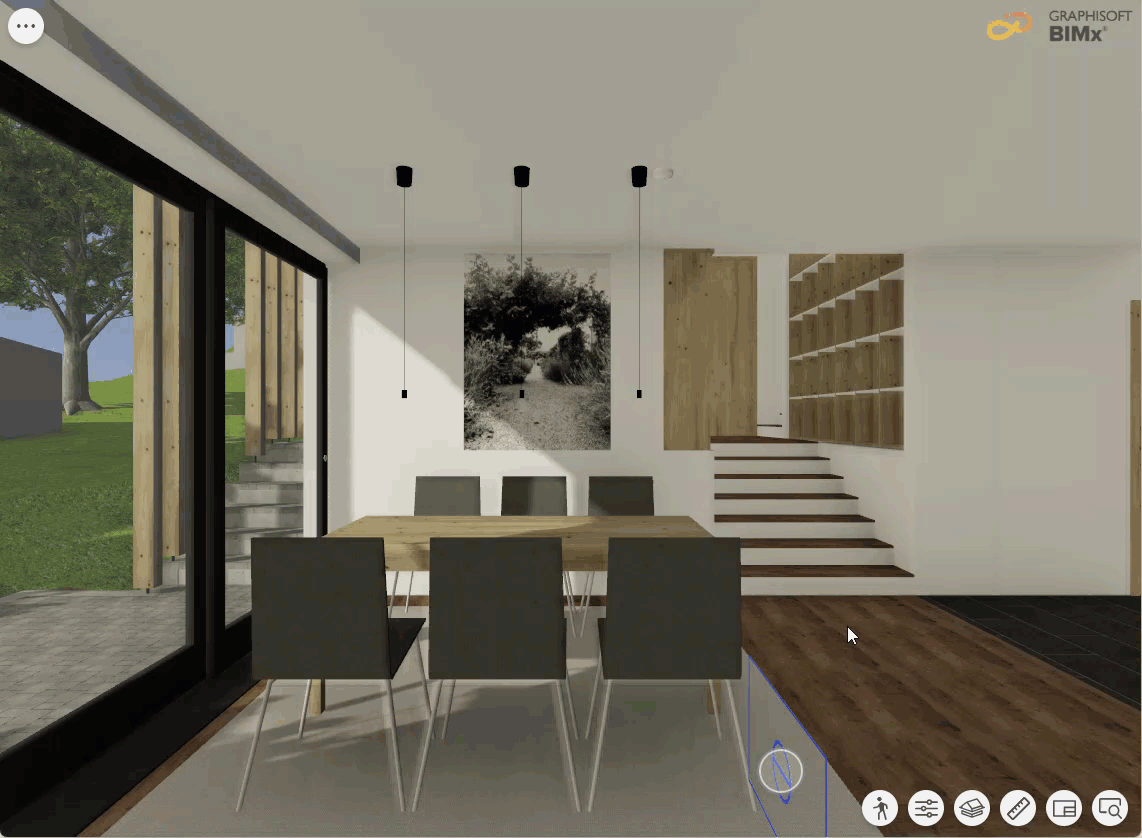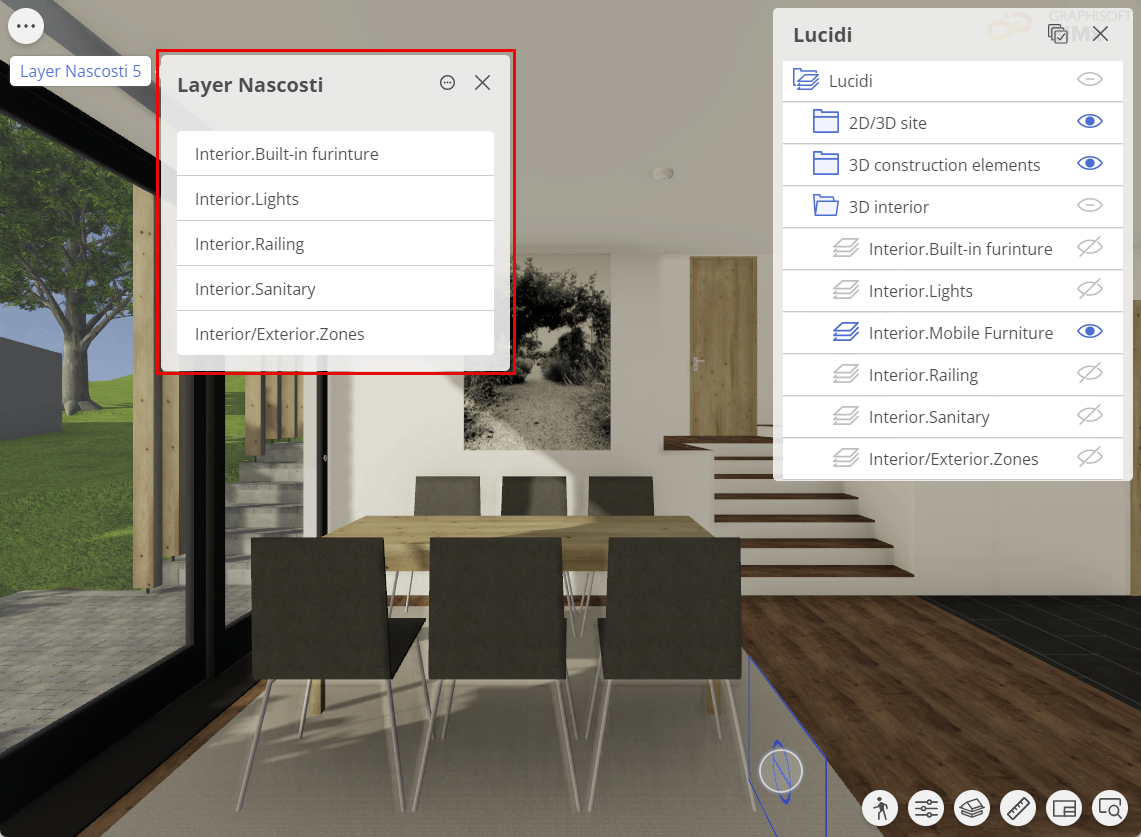 A differenza di Archicad, la selezione di un'altra combinazione di lucidi in BIMx non rivela elementi non inclusi nel modello 3D originale. Il contenuto dell'Iper-Modello BIMx deve essere definito prima della pubblicazione.