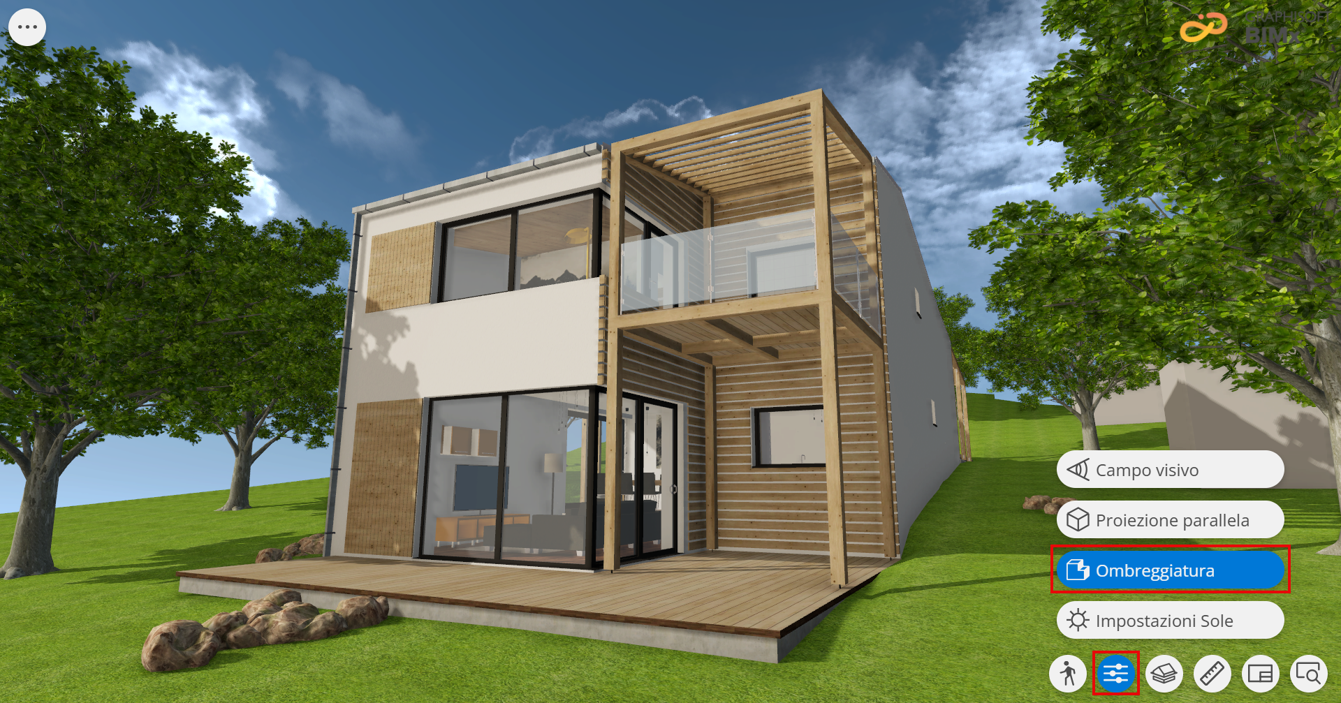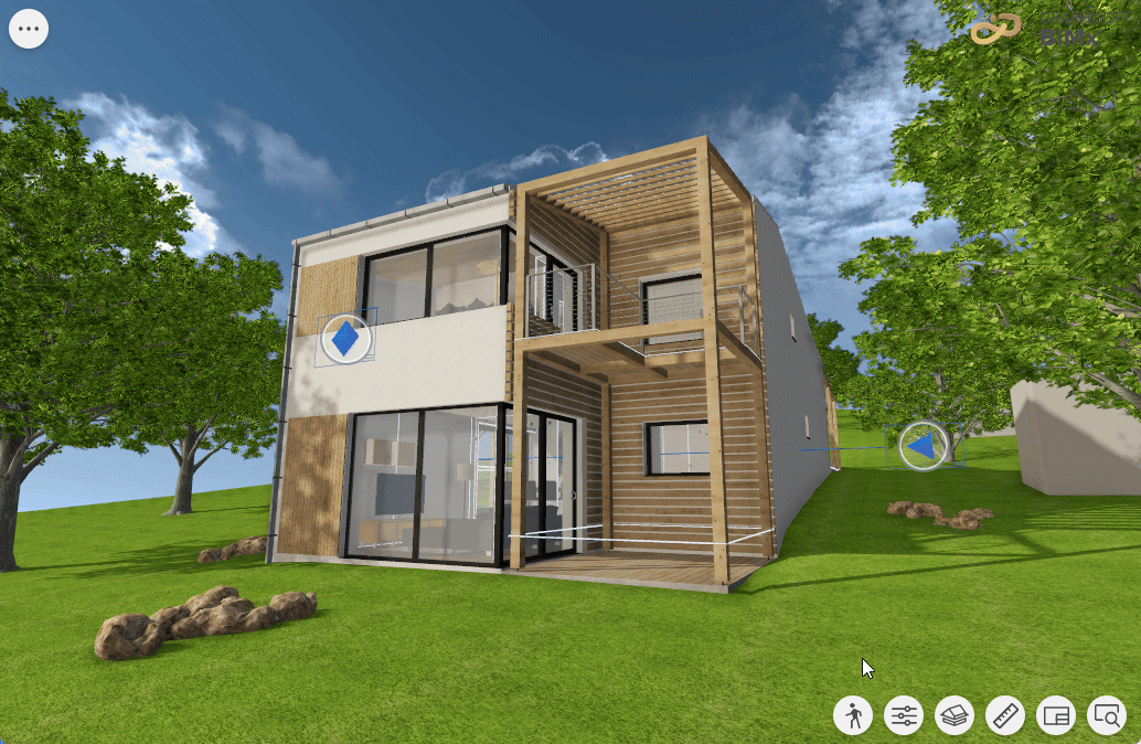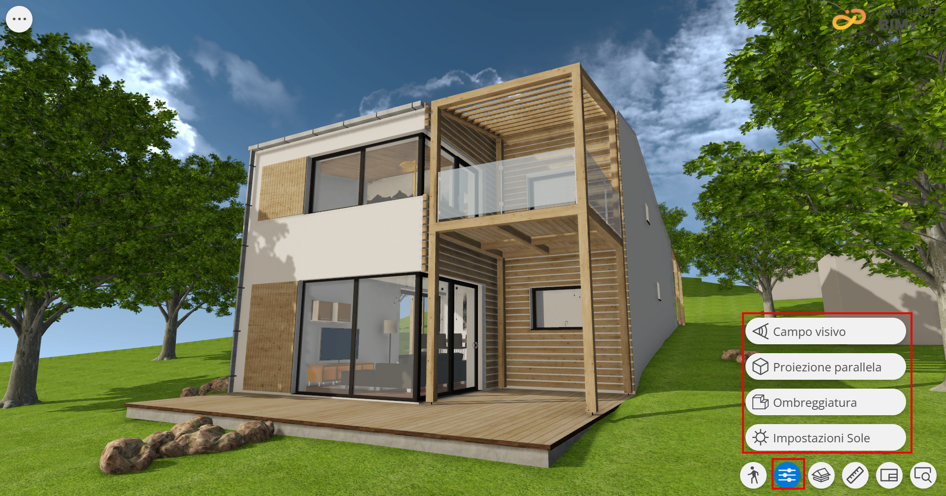 Da sapere: Facendo doppio clic o toccando due volte un elemento, l'edificio viene visualizzato frontalmente. Ciò consente di creare facilmente prospetti e sezioni assonometriche. Si può usare in combinazione con un piano di taglio e con varie posizioni del sole secondo le ore, e salvare le viste preferite.