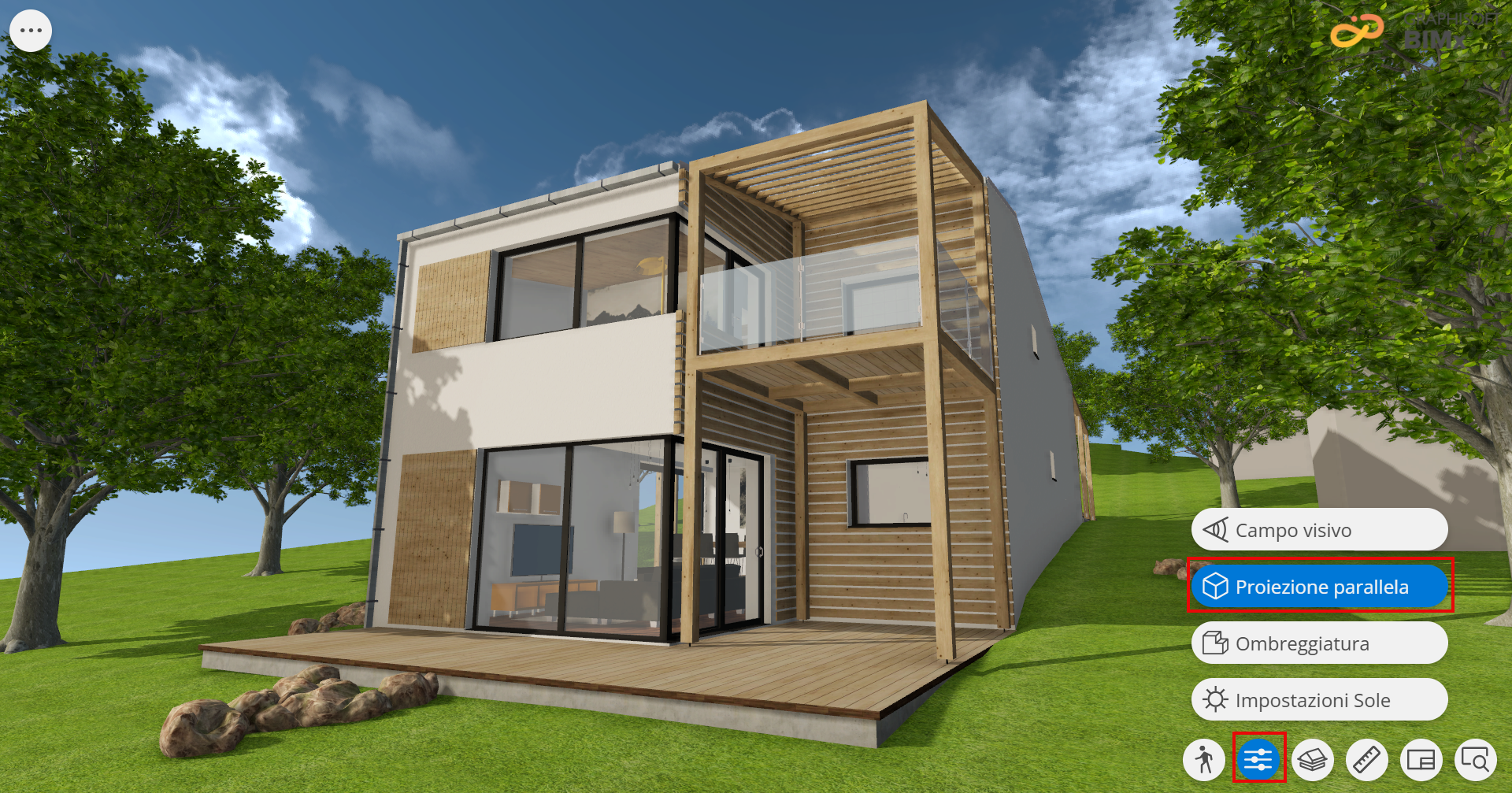 La proiezione predefinita di BIMx dipende dalle impostazioni della Vista 3D definite in Archicad. I modelli assonometrici 3D esportati in precedenza si apriranno automaticamente con la Proiezione parallela. Le impostazioni Gravità, Nascondi cursore, Joystick e Cono visivo della telecamera sono disattivate nella Proiezione parallela.