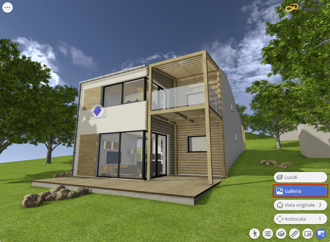 Il modello 3D dell'Iper-Modello BIMx può includere una galleria di una o più posizioni della fotocamera preselezionate sotto forma di viste 3D statiche o di filmato animato. Gli elementi della Galleria in BIMx sono opzionali e sono disponibili se sono stati definiti in Archicad durante la pubblicazione dell'Iper-Modello.