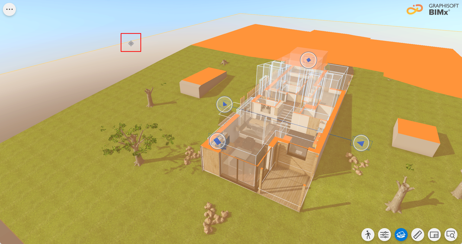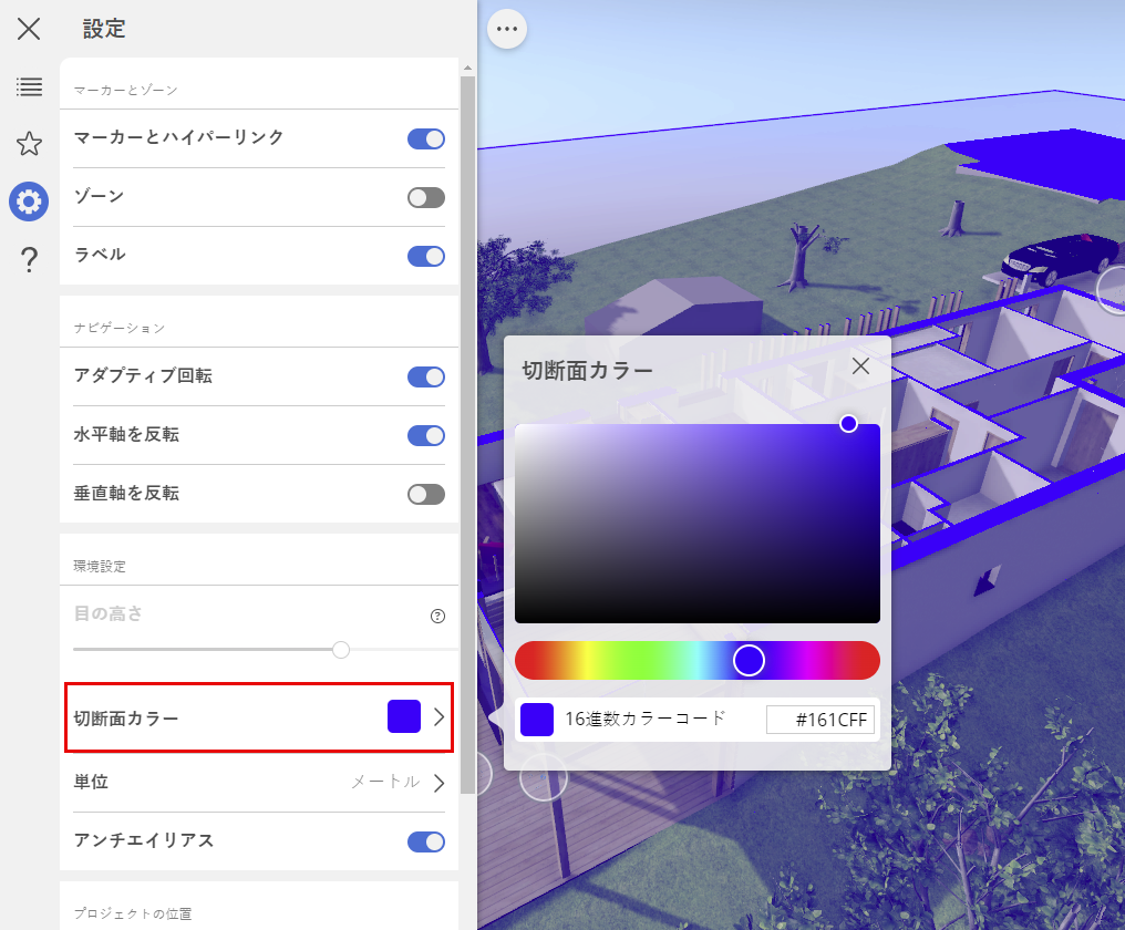 5. 枠にカーソルを合わせると切断面が表示されます。切断面の色は、BIMxの設定の切断面カラーピッカーを使用して変更できます。「切断面カラーピッカー