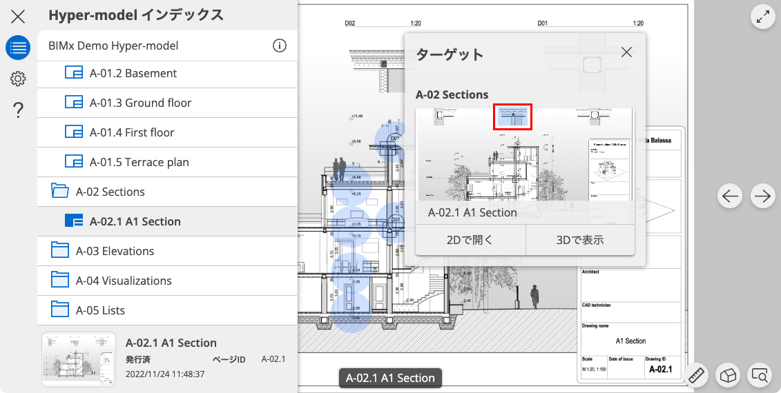1. 任意の2D、3Dマーカーをクリックすると[ターゲット]ダイアログが開き、対応するビューの名前とプレビューが表示されます。