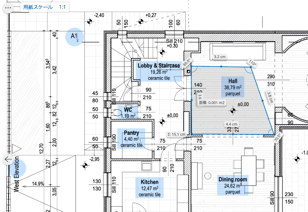 壁の一辺の長さだけを計測したり、閉じた部分を計測このツールは、3つのポイントが配置されるとすぐに面積を出すことができます。得られる計測値: