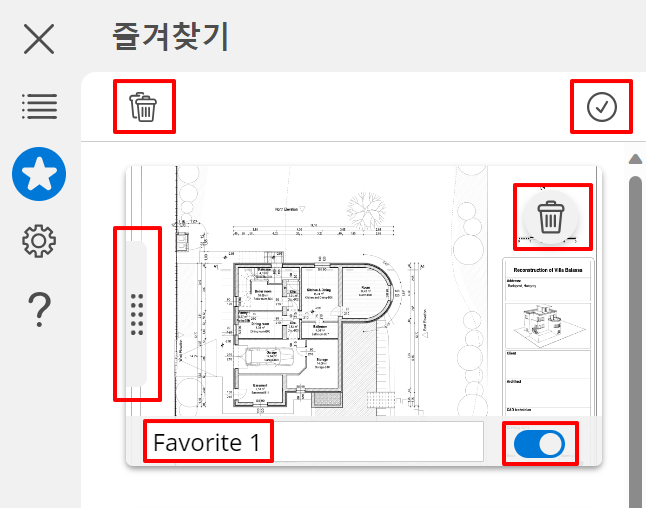 갤러리 (Archicad 3D 모델에서 저장된 카메라 위치가 포함된)와 달리 즐겨찾기는 하이퍼 모델의 2D 또는 3D 항목에서 원하는 방식으로 모든 3D 설정을 포함하여 BIMx에 저장됩니다. BIMx에서 즐겨 찾는 프레젠테이션의 순서와 표시 여부를 쉽게 편집할 수 있습니다.