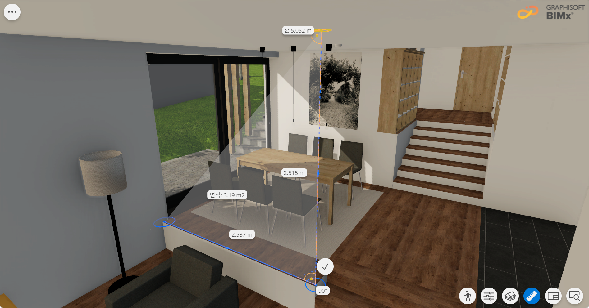 BIMx 하이퍼 모델에 있는 3D 모델을 엽니다. 측정 도구는 2D에서와 거의 동일하게 작동하지만 다음과 같은 차이점이 있습니다.