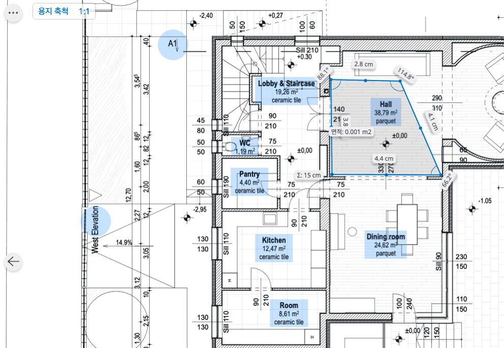 한쪽 벽의 길이만 측정하거나 폐쇄된 면적을 측정할 수 있습니다. 이 도구는 세 개의 포인트를 배치하는 즉시 측정된 면적을 제공할 수 있습니다. 주어진 측정값: