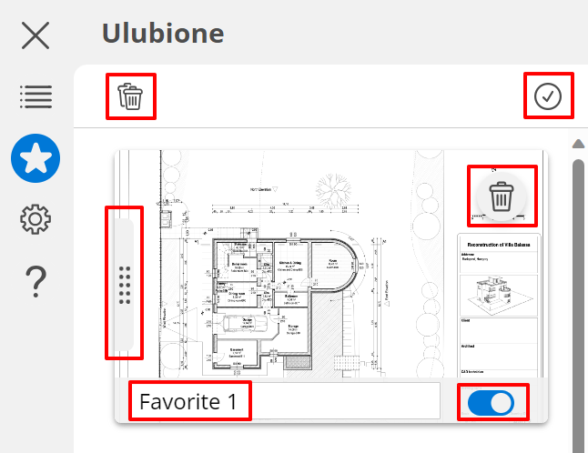 W przeciwieństwie do Galerii (która zawiera pozycje kamery zapisane z modelu Archicad 3D), Ulubione są zapisywane w BIMx z dowolnego elementu 2D lub 3D w Hipermodelu, uwzględniając wszystkie ustawienia 3D tak, jak lubisz. W BIMx można łatwo edytować kolejność i widoczność prezentacji Ulubionych.