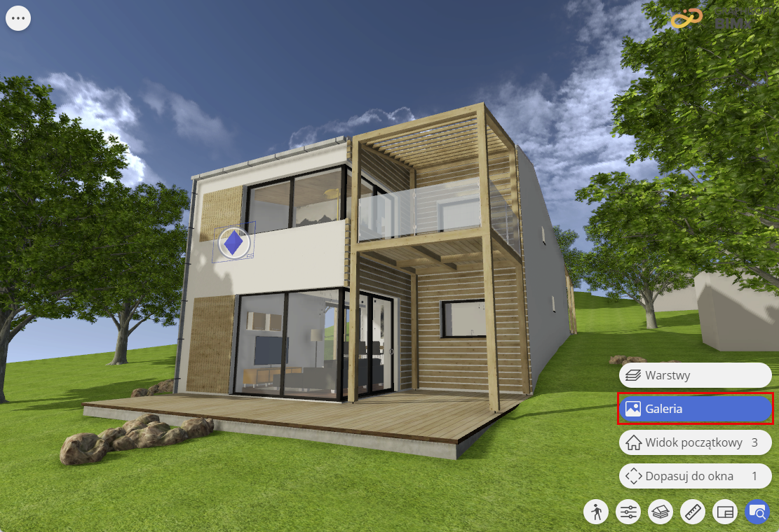 Model 3D Twojego pliku BIMx Hyper-model może zawierać galerię jednej lub więcej zapisanych, nazwanych pozycji kamery: obrazów statycznych 3D, lub animacji. Elementy galerii w BIMx są opcjonalne; są one dostępne, jeśli zostały zdefiniowane w Archicadzie podczas publikowania hipermodelu.